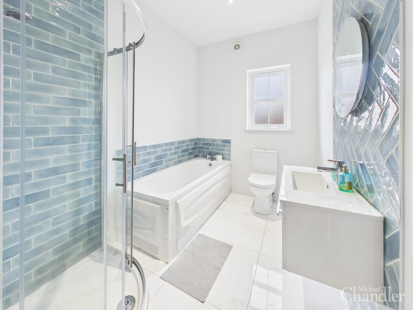 Upstairs are three generously sized double bedrooms, with the master benefiting from an ensuite shower room and an additional separate family bathroom ideal for families seeking extra space.