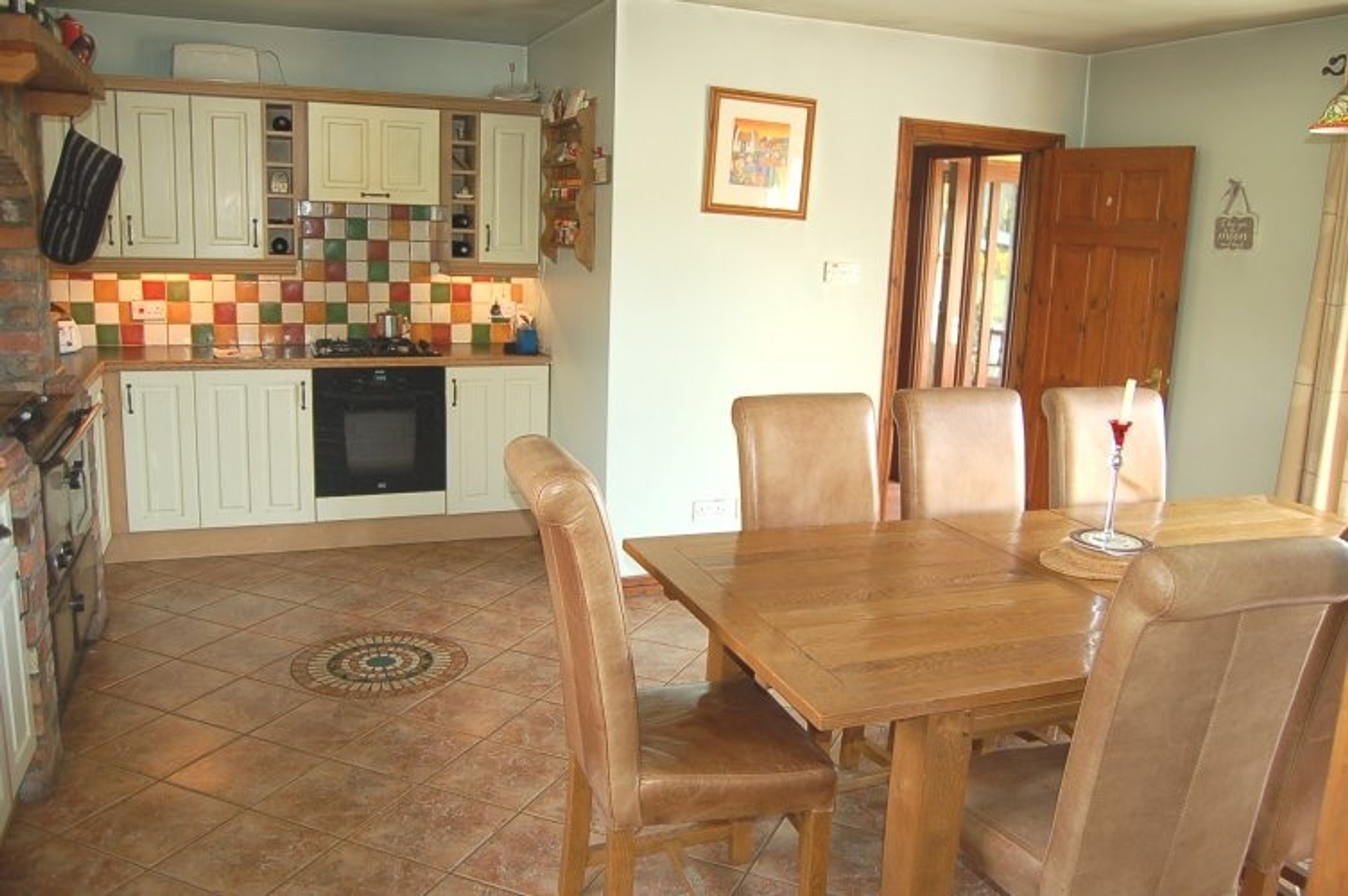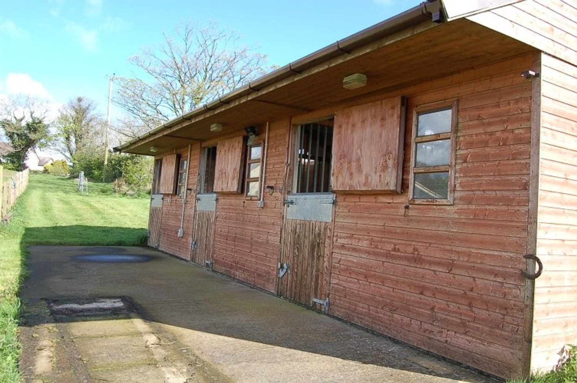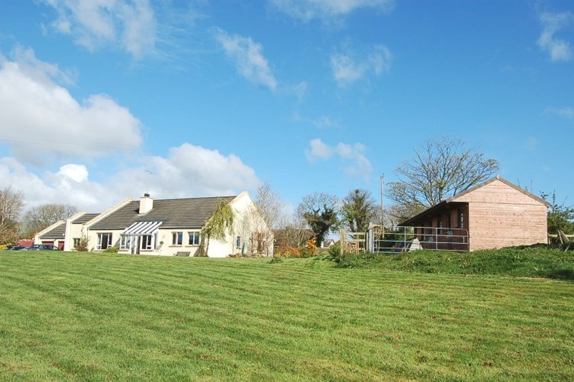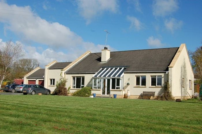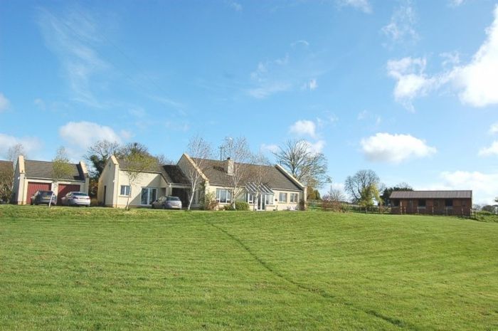 The cottage style bungalow was built in 1996 and comprises, spacious hall, living and sitting rooms, a large kitchen with Stanley Range and space for dining table, utility room, master bedroom with en suite, three further bedrooms and bathroom. The property sits in the middle of the two acres which at present are in lawn but previously there were two paddocks, one the the front of the property and the other to the rear. Re-fencing the paddocks would be a straightforward process. Along with the stables there is a detached double garage.