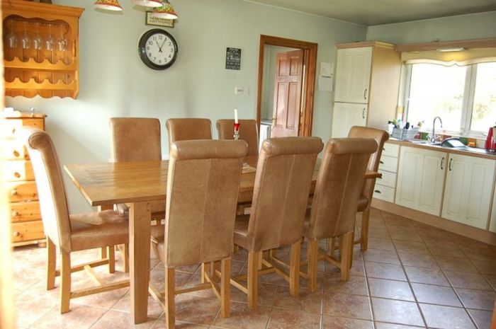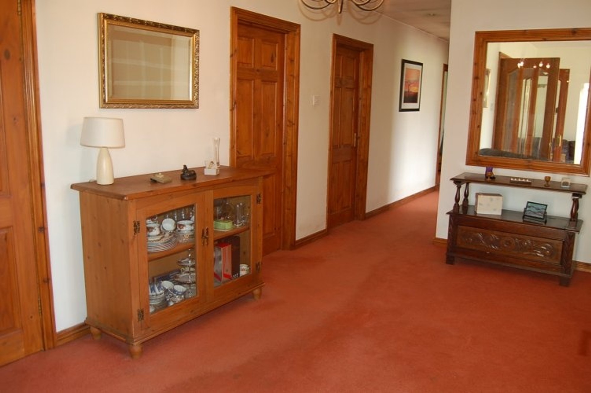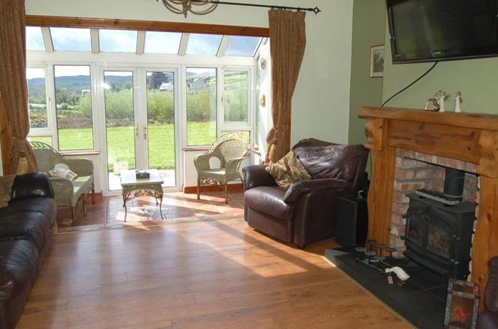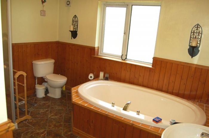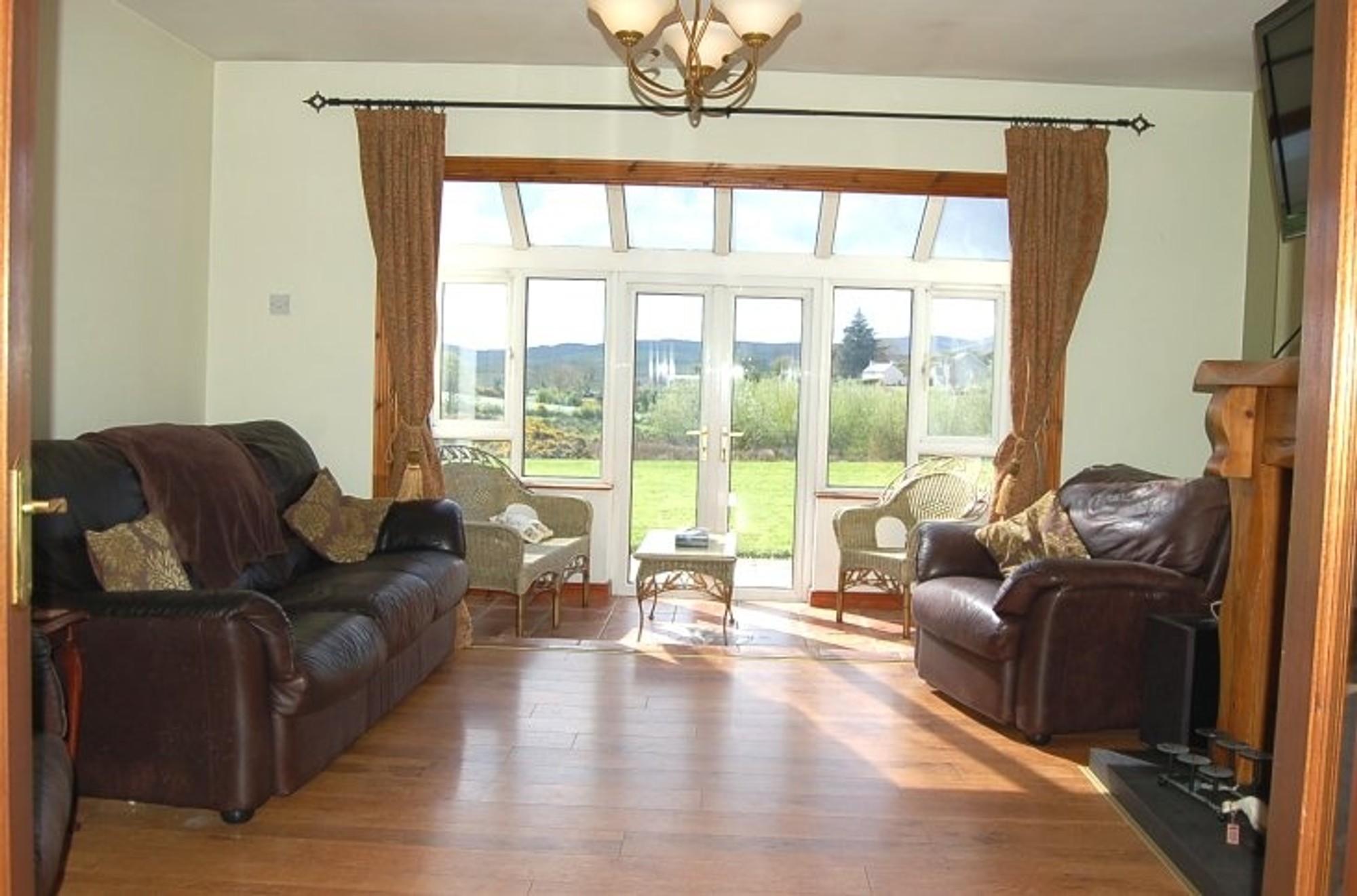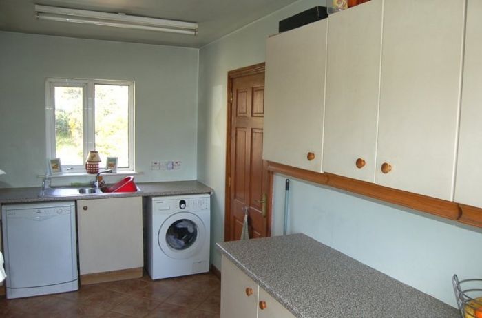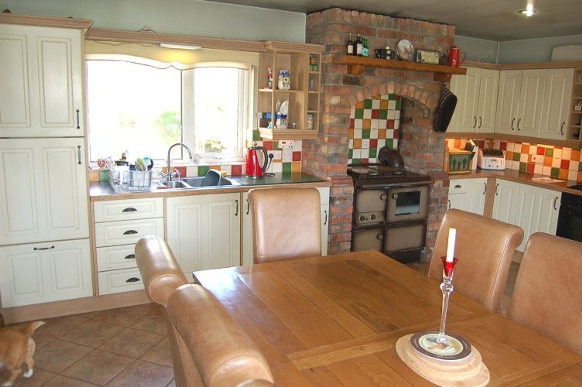 The cottage style bungalow was built in 1996 and comprises, spacious hall, living and sitting rooms, a large kitchen with Stanley Range and space for dining table, utility room, master bedroom with en suite, three further bedrooms and bathroom. The property sits in the middle of the two acres which at present are in lawn but previously there were two paddocks, one the the front of the property and the other to the rear. Re-fencing the paddocks would be a straightforward process. Along with the stables there is a detached double garage.