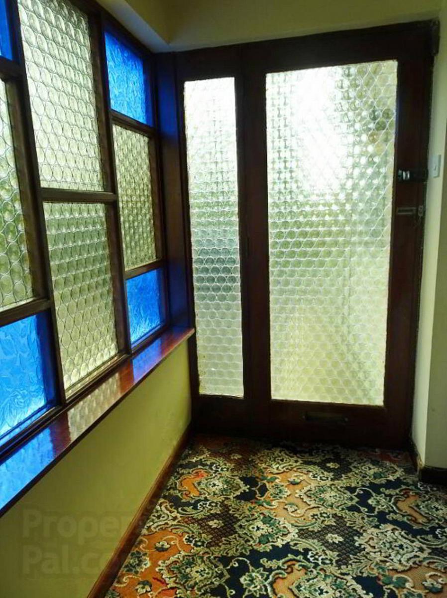 Coloured glass feature porch, glazed exterior door, glazed door and side screen to Entrance Hall.