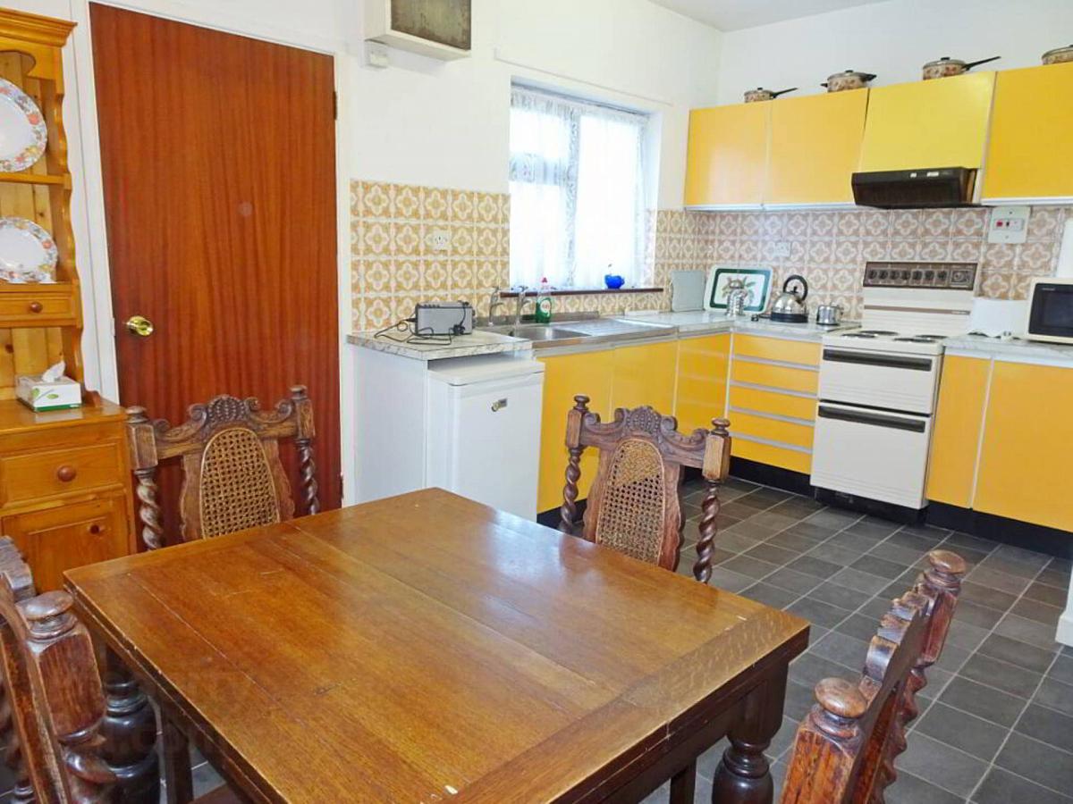 Fitted high and low level units, extractor fan hood, stainless steel sink unit, tiled splashback hotpress.