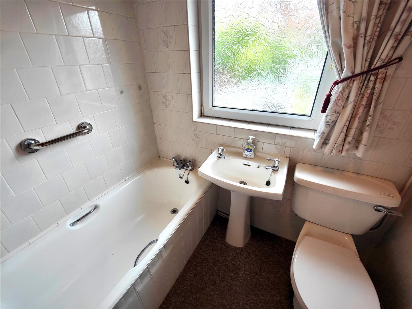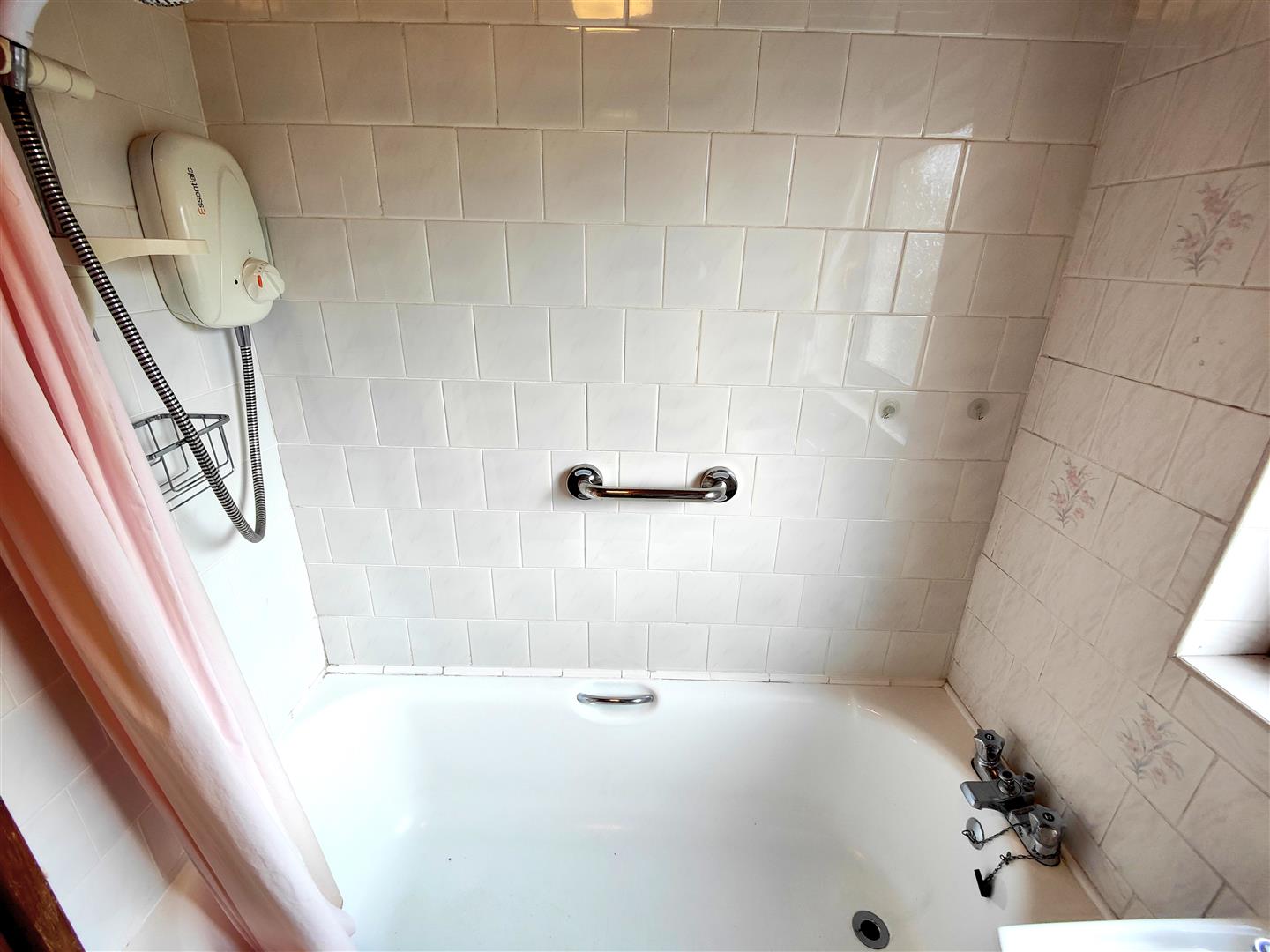 Classic white bathroom suite comprising panelled bath, electric shower, pedestal wash hand basin, low flush wc, fully tiled walls, extractor fan, built-in storage, hot-press.