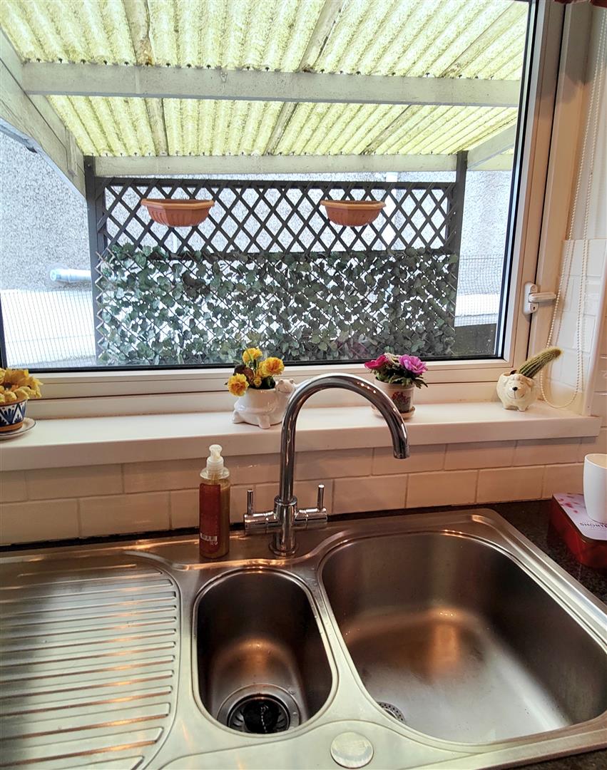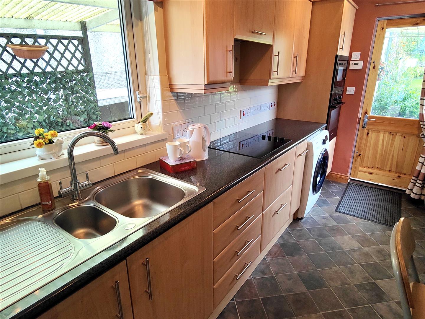 Bowl and 1/2 drainer stainless steel sink unit, range of high and low level units, formica worktops, built-in level oven, ceramic hob, canopy extractor fan, fridge/freezer space, integrated microwave, breakfast bar, partly tiled walls, hardwood door to rear.