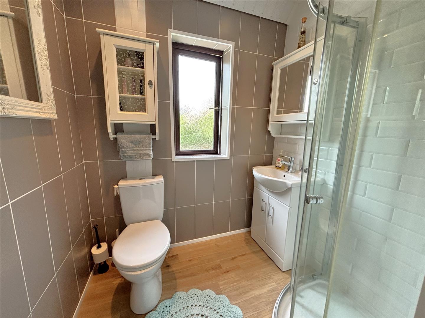 Modern white bathroom suite comprising shower cubicle, electric shower, vanity unit, low flush wc, fully tiled walls, pvc ceiling, recessed lighting.