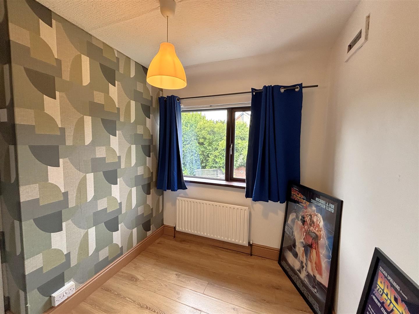 Wood laminate floor, panelled radiator.
