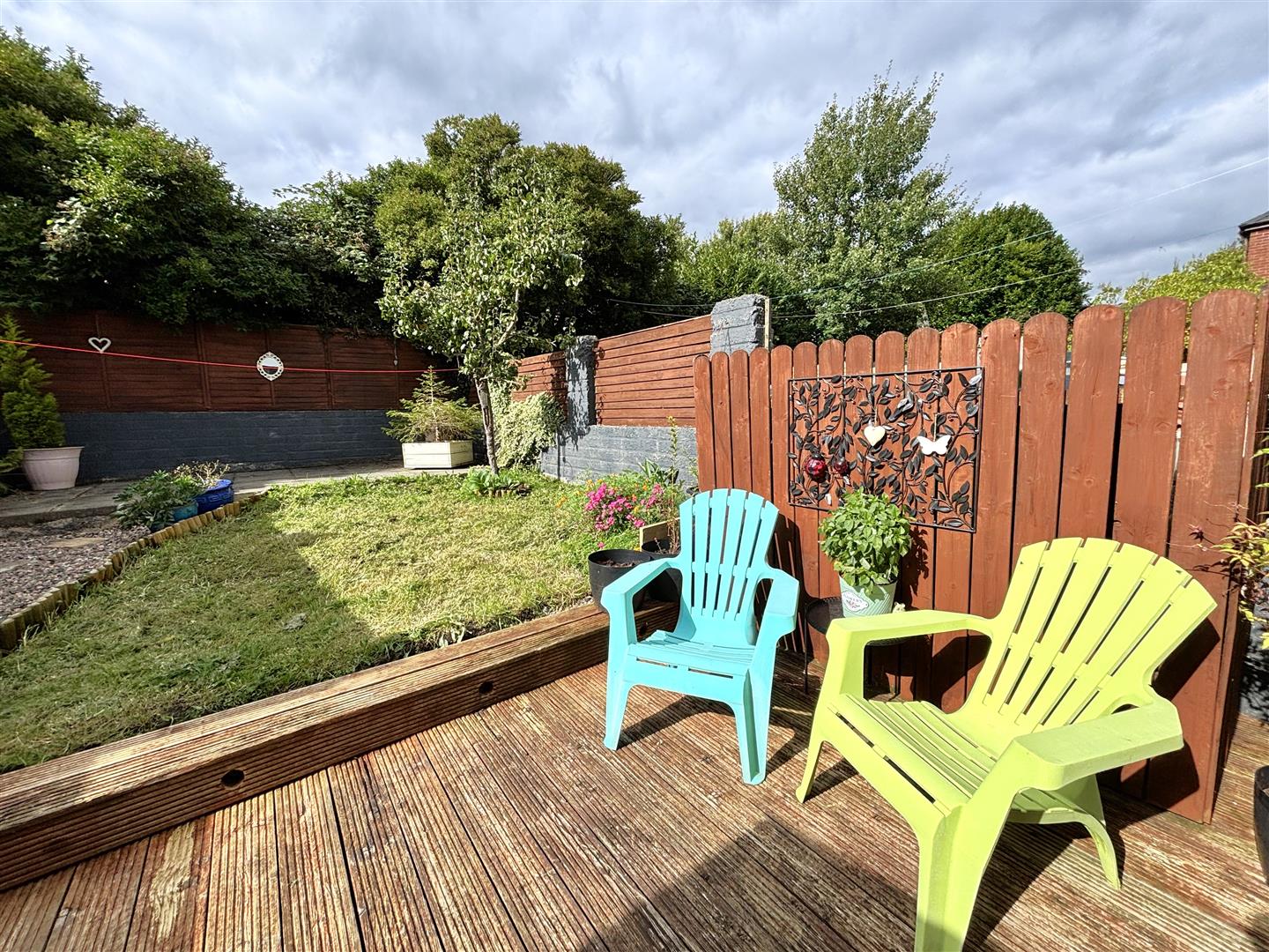 Hard landscaped front garden with stone chippings. Private rear gardens including decked patio area, stone chippings and mature lawn.