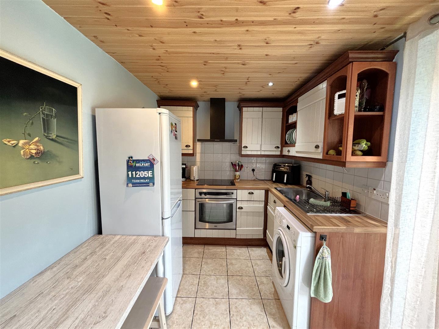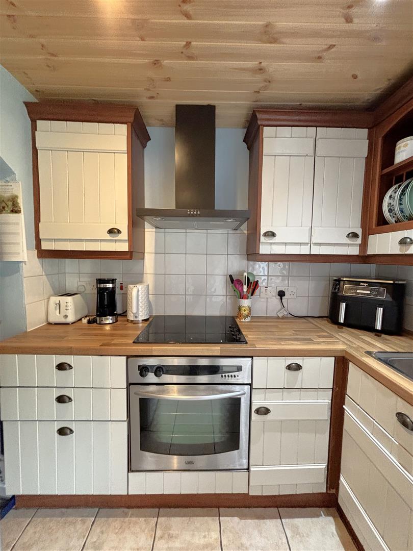 Single drainer stainless steel sink unit, range of high and low level units, formica worktops, built-in under oven and hob, canopy extractor fan, fridge/freezer space, plumbed for washing machine, ceramic tiled floor, double panelled radiator, recessed lighting, uPvc patio doors to rear.