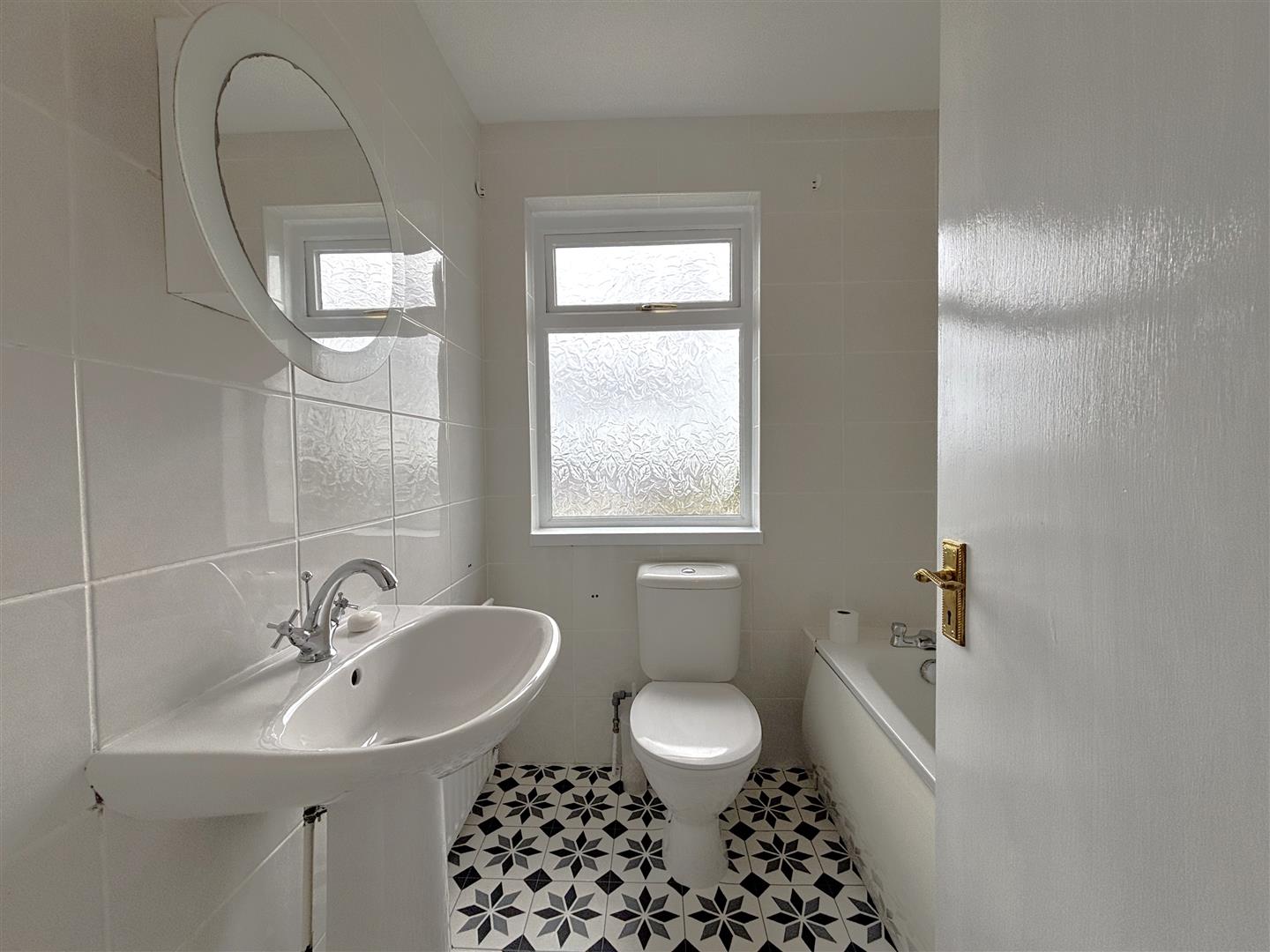 Fully tiled modern white suite comprising panelled bath, thermostatically controlled telephone handset shower, pedestal wash hand basin, fully tiled walls, panelled radiator,