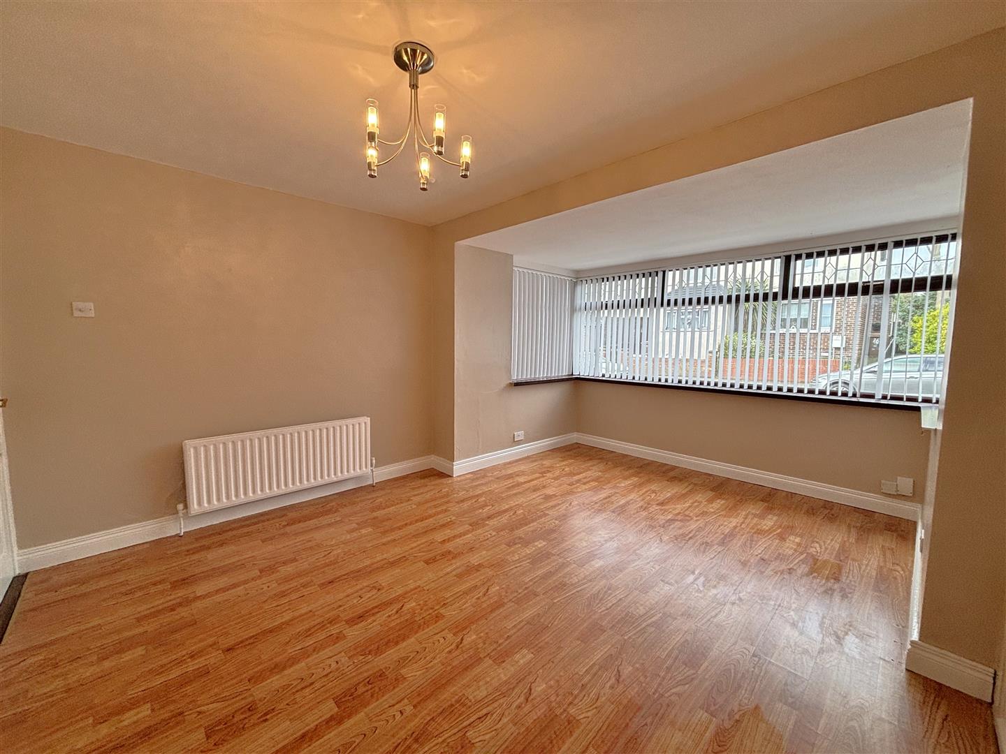 Wood laminate floor, panelled radiator.