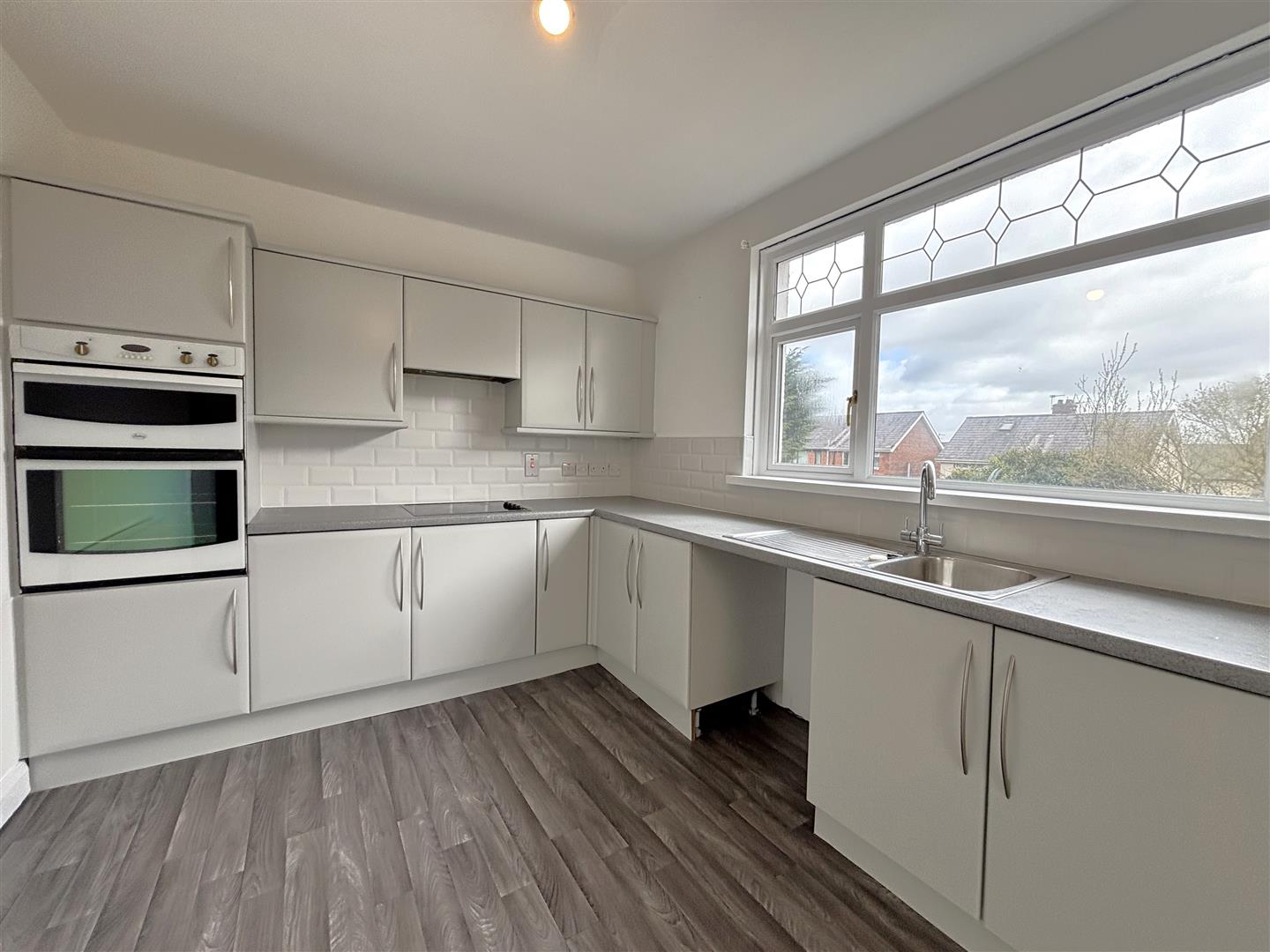 Single drainer stainless steel sink unit, extensive range of high and low level units, formica worktops, ceramic hob, raised oven, integrated extractor fan, plumbed for washing machine, integrated under unit fridge/freezer, panelled radiator, partially panelled walls, pvc door to rear.