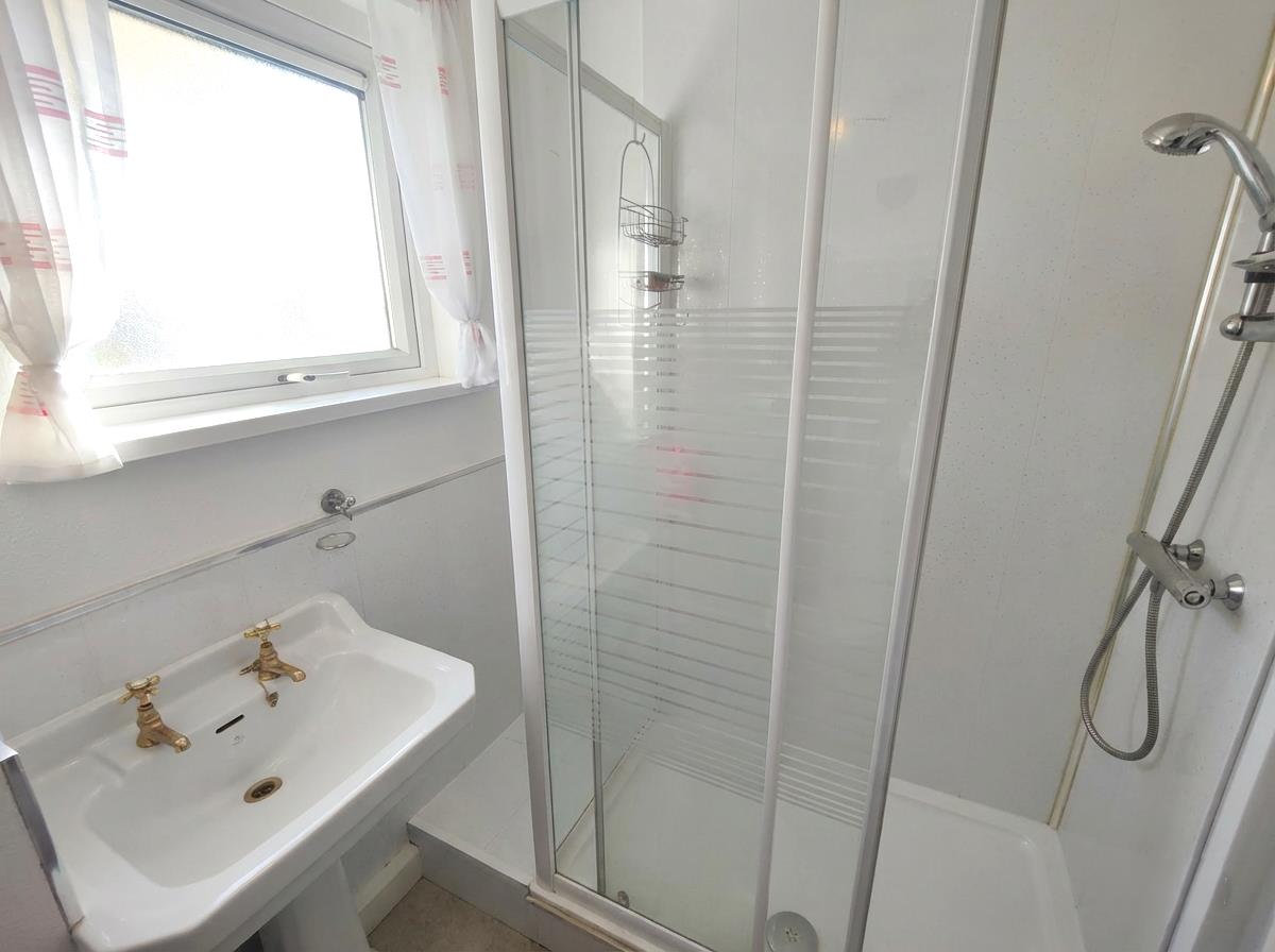 Modern white suite comprising walk-in shower, thermostatically controlled telephone handset shower unit, pedestal wash hand basin, low flush wc, chrome radiator, wood laminate floor, partly pvc panelled walls, built-in cupboard.
