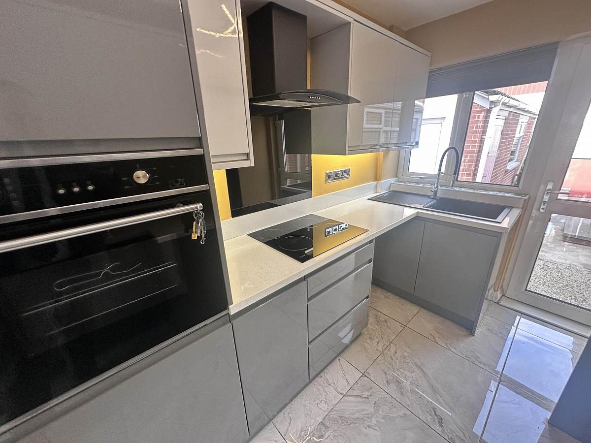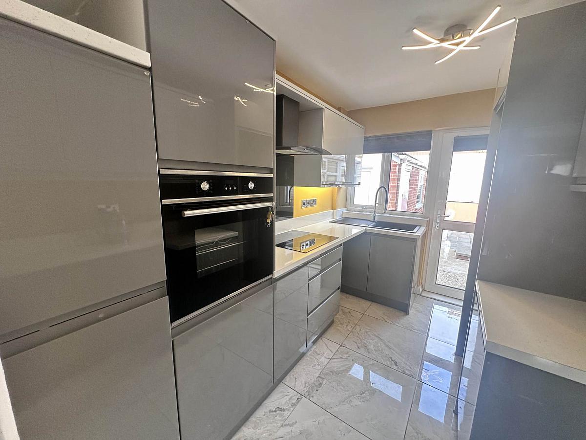 Modern white kitchen suite with range of high and low level units, ceramic tiled floors, formica work surfaces, black sink unit, integrated hob and oven, with black extractor unit, part tiled walls, plumbed for washing machine.