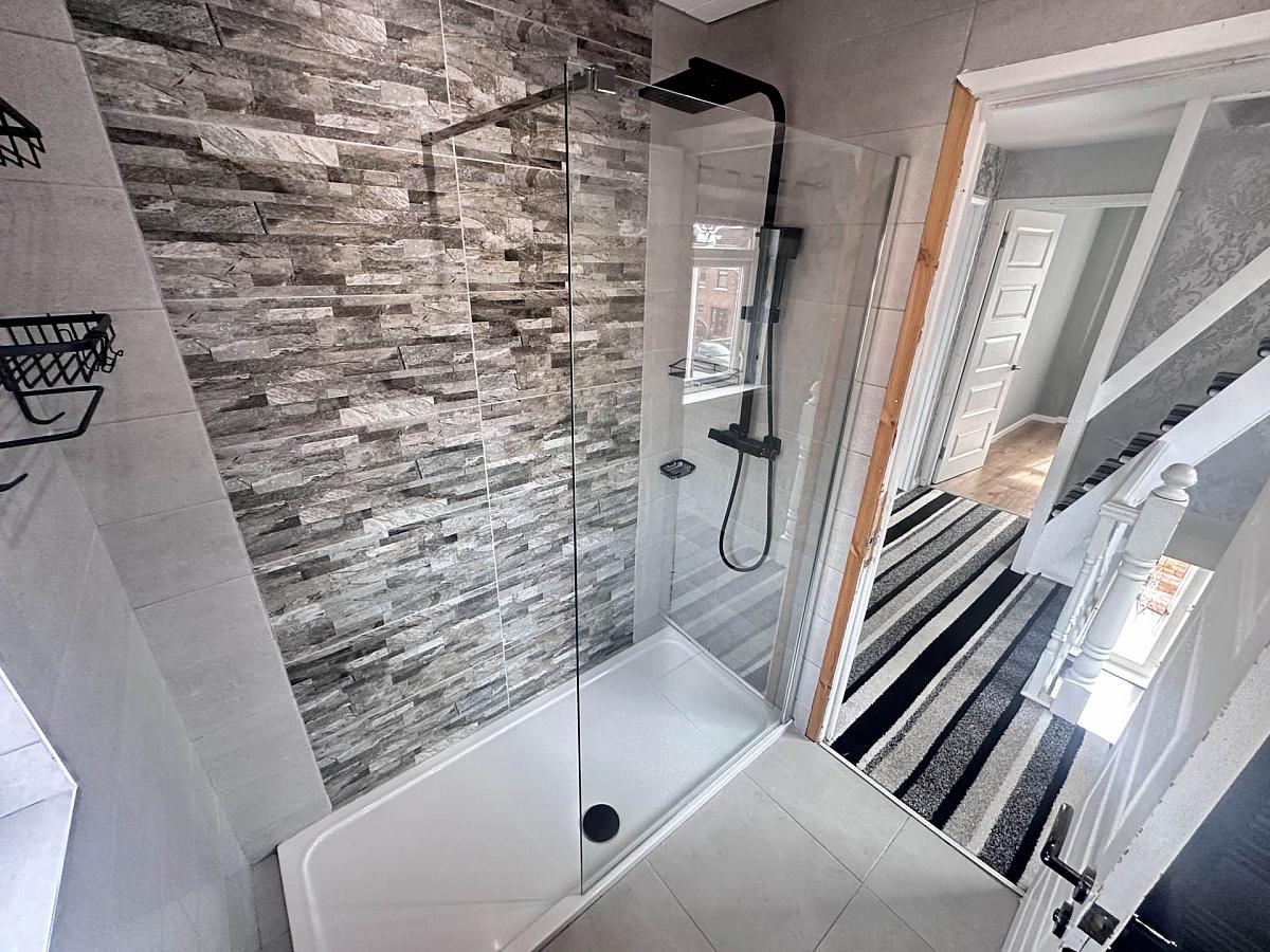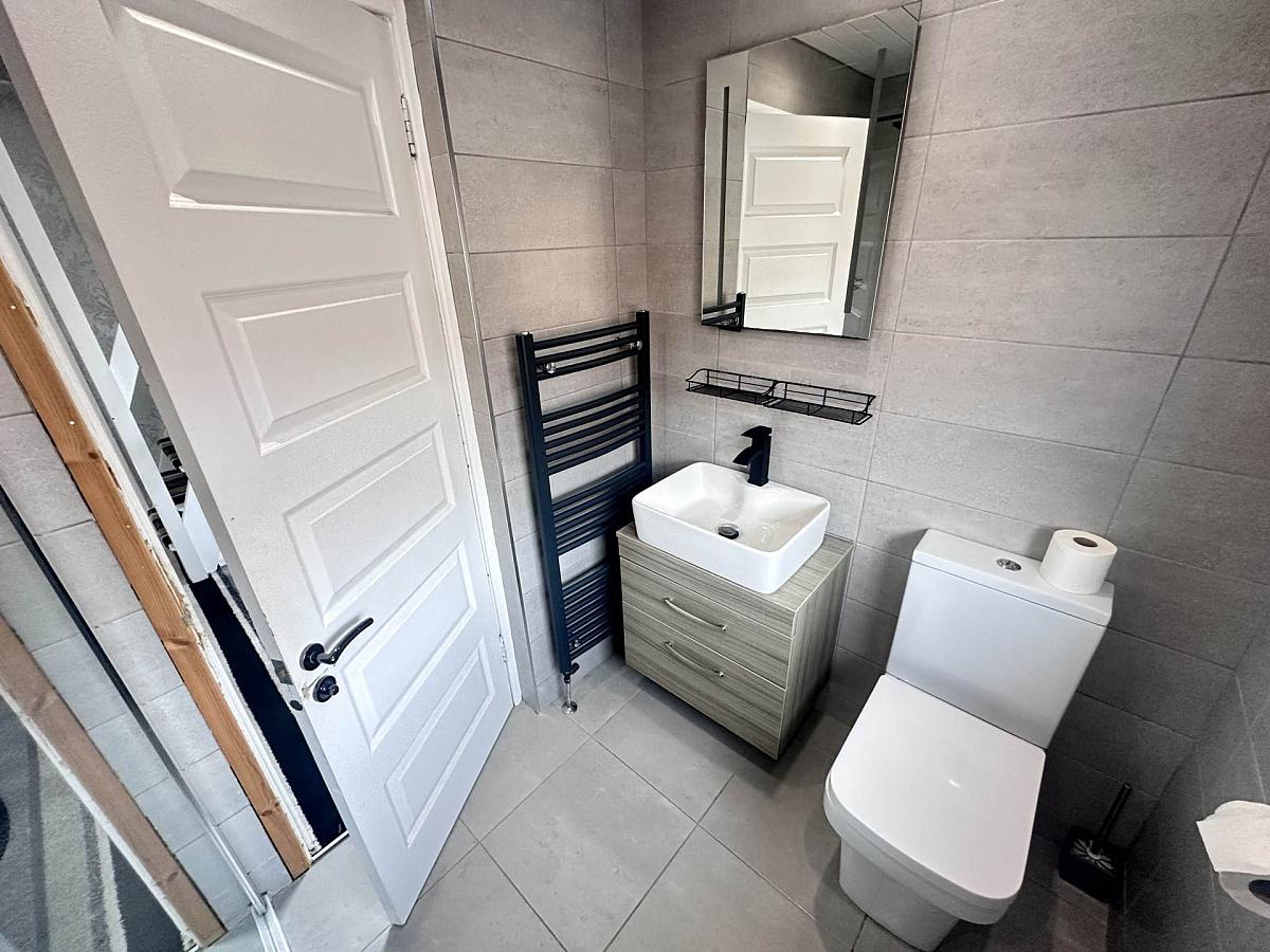 Modern white bathroom suite with walk in shower, low flush W.C,vanity unit wash hand basin,ceramic tiled flooring, and black towel rail.
