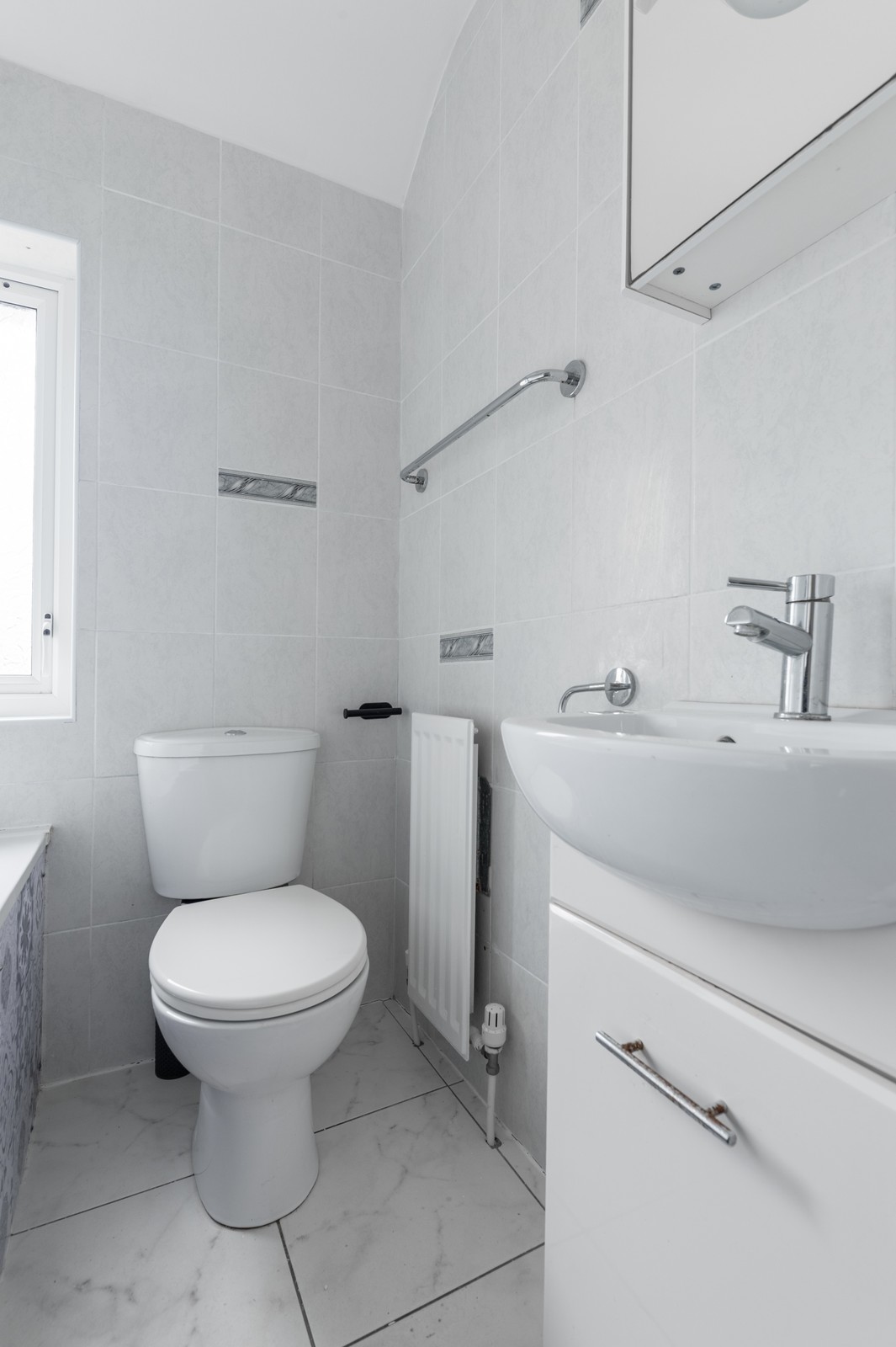 Bathroom: 1.43m x 1.44m, modern suite with bath and overhead shower, toilet, wash hand basin, grey tiled flooring, and grey tiled walls.