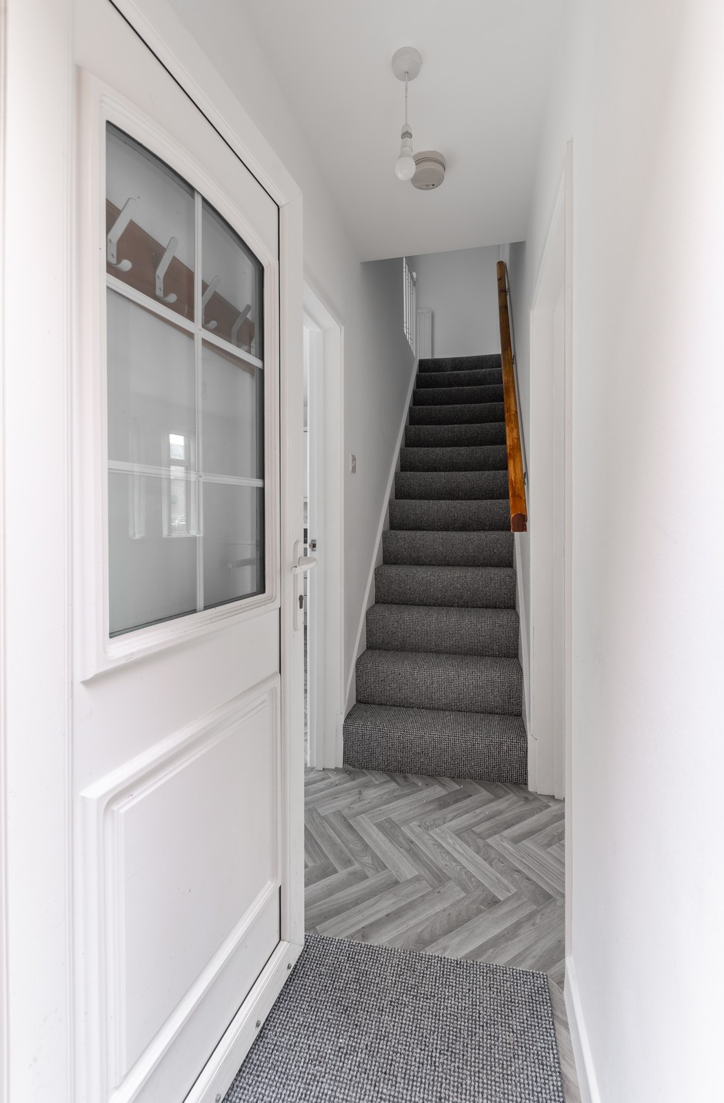 Entrance Hall: PVC front door, grey herringbone lino, pendant light.