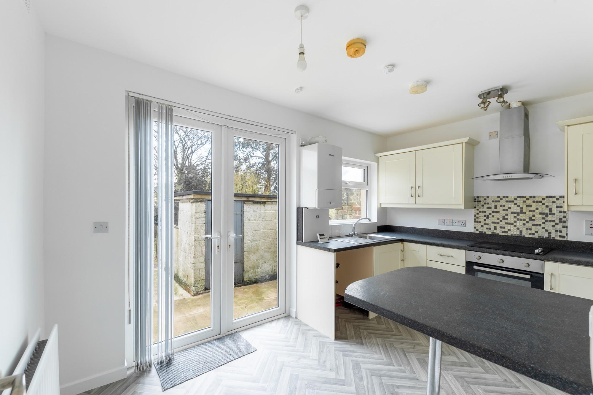 Kitchen: 3.35m x 2.19m with adjoining dining area 2.36m x 1.81m. PVC French doors leading to the rear garden. Cream shaker-style kitchen with breakfast bar, integrated hob and oven, grey herringbone lino flooring, and pendant light.