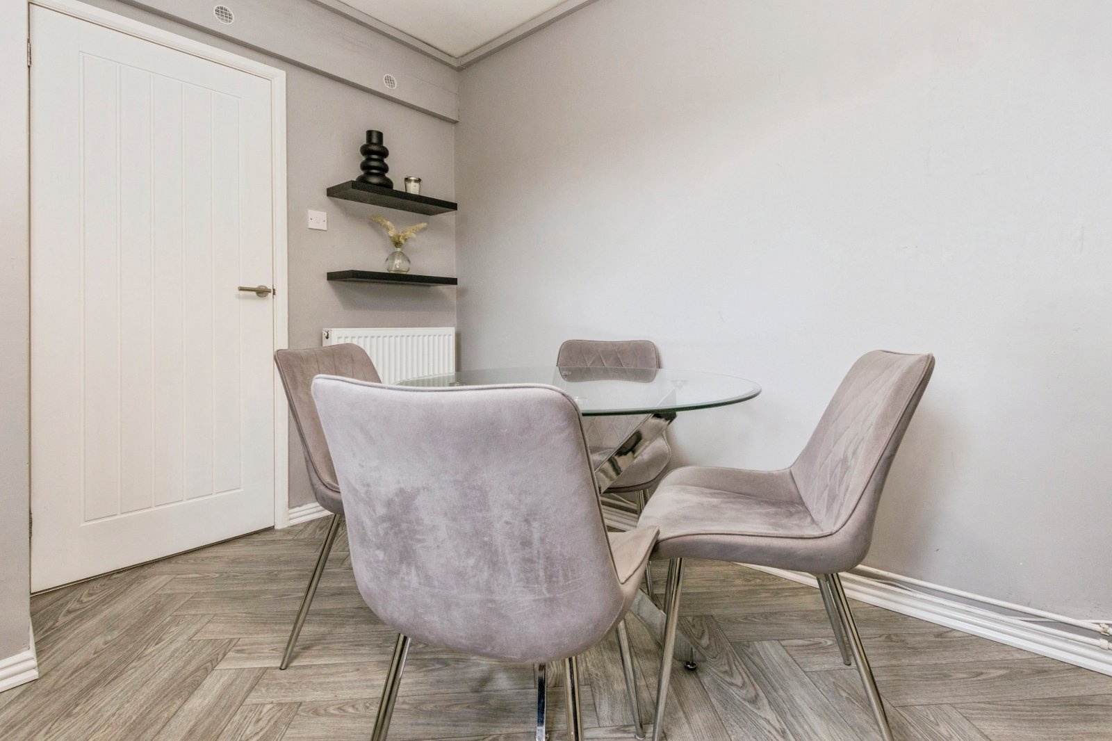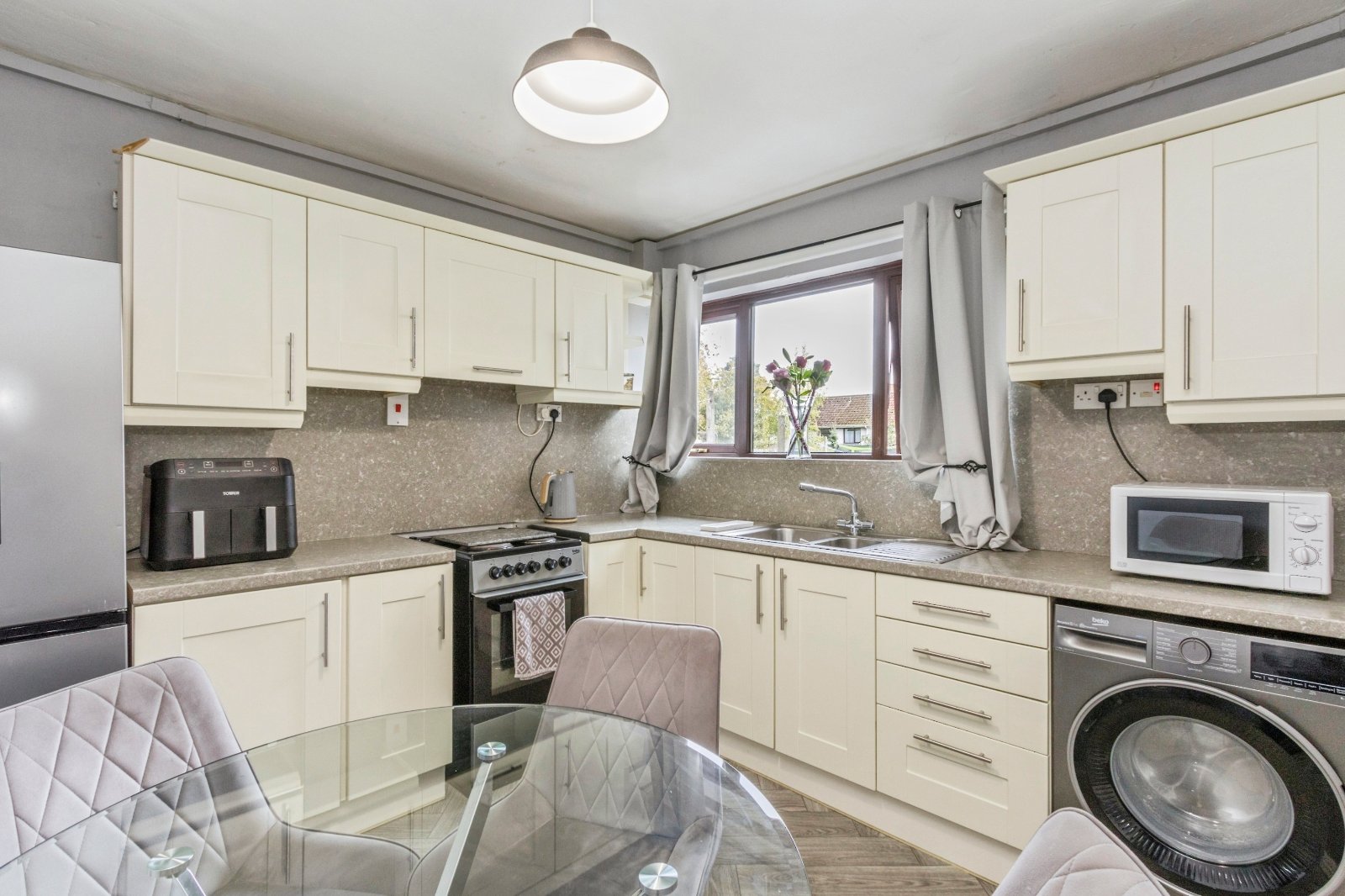 Modern fitted range of high and low level cabinets, laminate work tops, single drainer stainless steel sink unit, plumbed for washing machine, casual dining area.