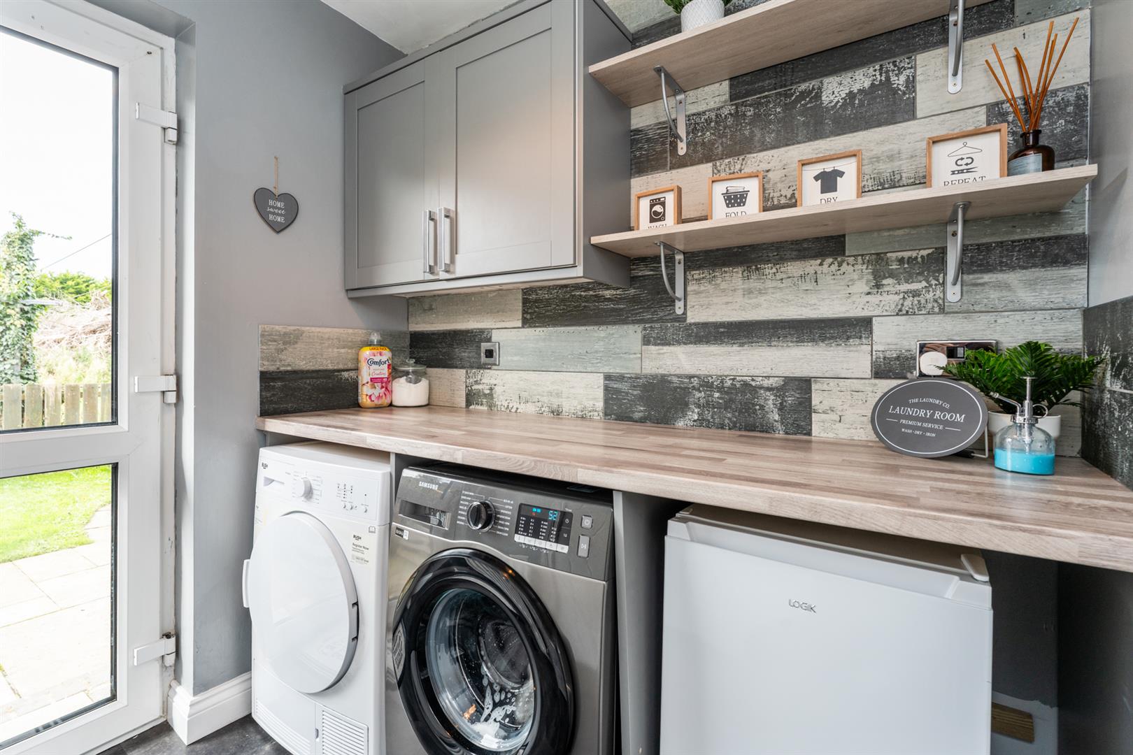 Range of high and low level units, laminate work surfaces, plumbed for washing machine, space for tumble dryer, laminated work surfaces, back door to enclosed rear garden, partly tiled walls and engineered stone flooring.