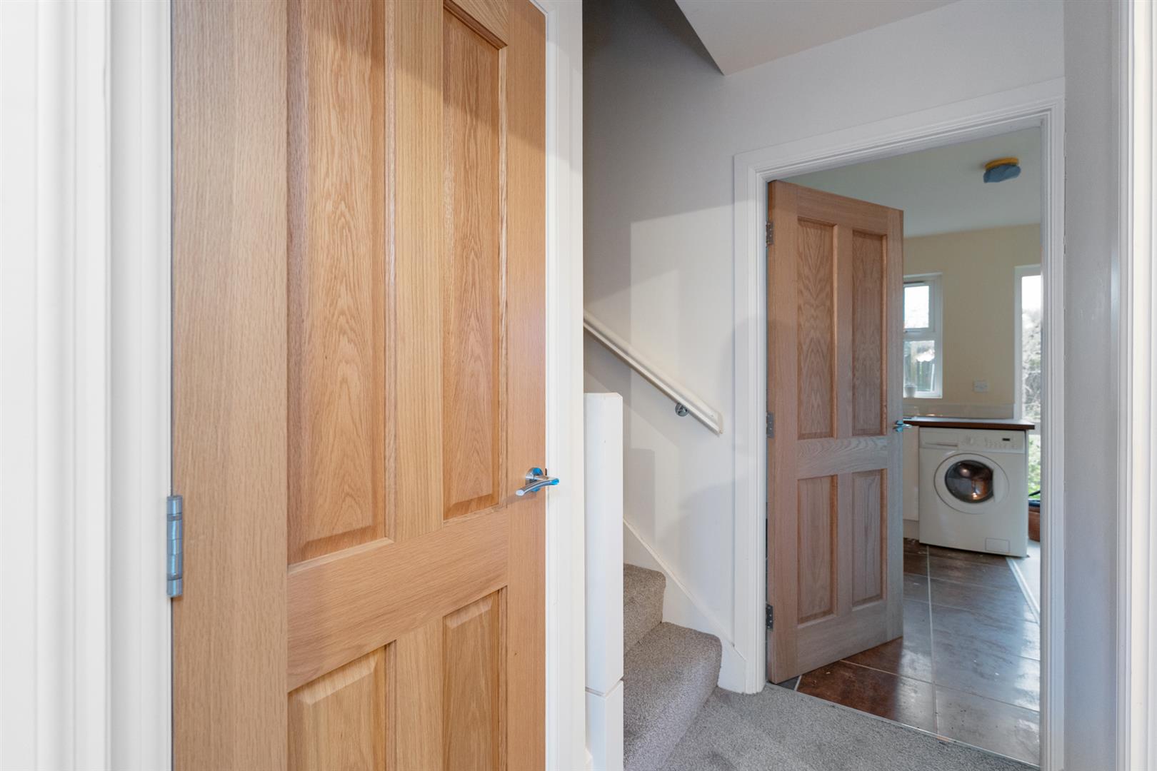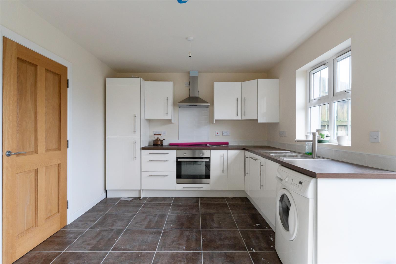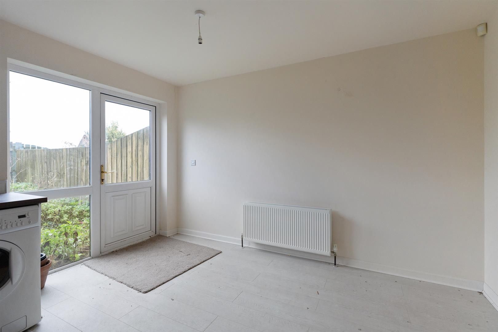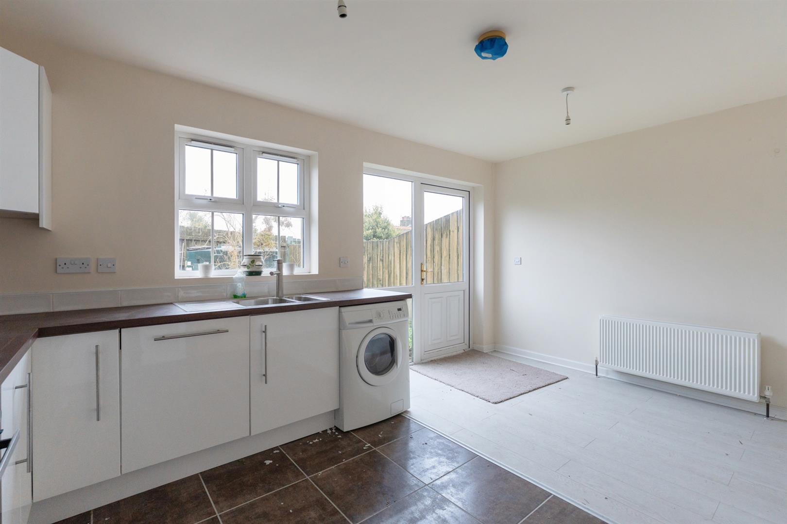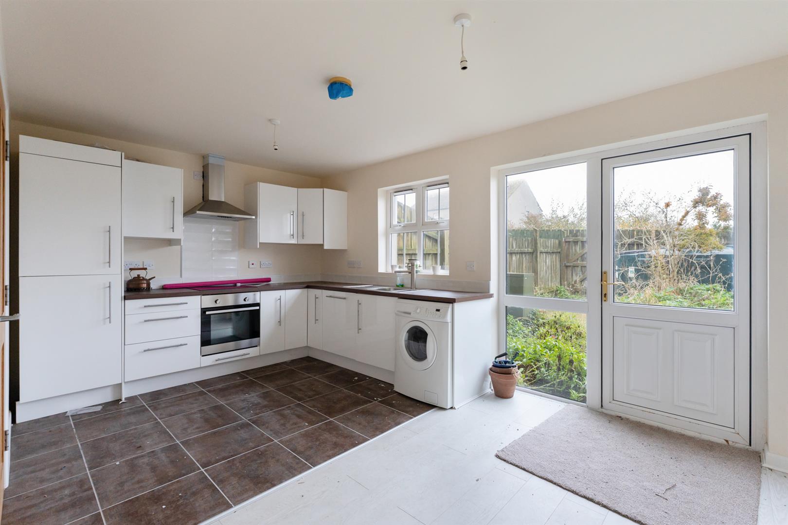 Fitted kitchen with a range of high and low level units, laminate work surfaces, one and a quarter stainless steel sink with mixer tap and drainer, integrated fridge/freezer, dishwasher, oven, and four-ring electric hob with stainless steel extractor hood. Tile splashback, tiled and part wood laminate flooring, space for dining, plumbed for washing machine, and back door leading to enclosed rear garden.