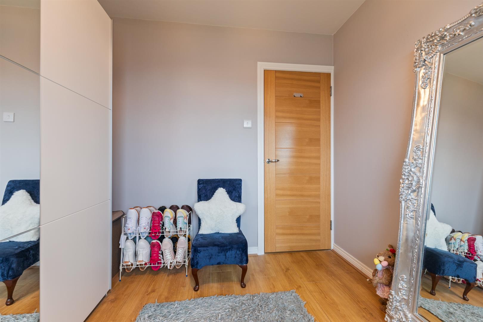 The accommodation is thoughtfully laid out and begins with a welcoming entrance hall featuring wood laminate flooring and built-in storage. The spacious living room enjoys a warm and inviting atmosphere with wood laminate flooring, an electric fireplace set on a tiled hearth with brick surround and wooden mantle. To the rear, the impressive kitchen and dining area provides an excellent space for everyday living and entertaining, featuring a modern fitted kitchen with granite work surfaces, Belfast style sink, integrated appliances, recessed spotlights and wood laminate flooring. Double doors open directly to the enclosed rear garden, enhancing the indoor-outdoor flow.