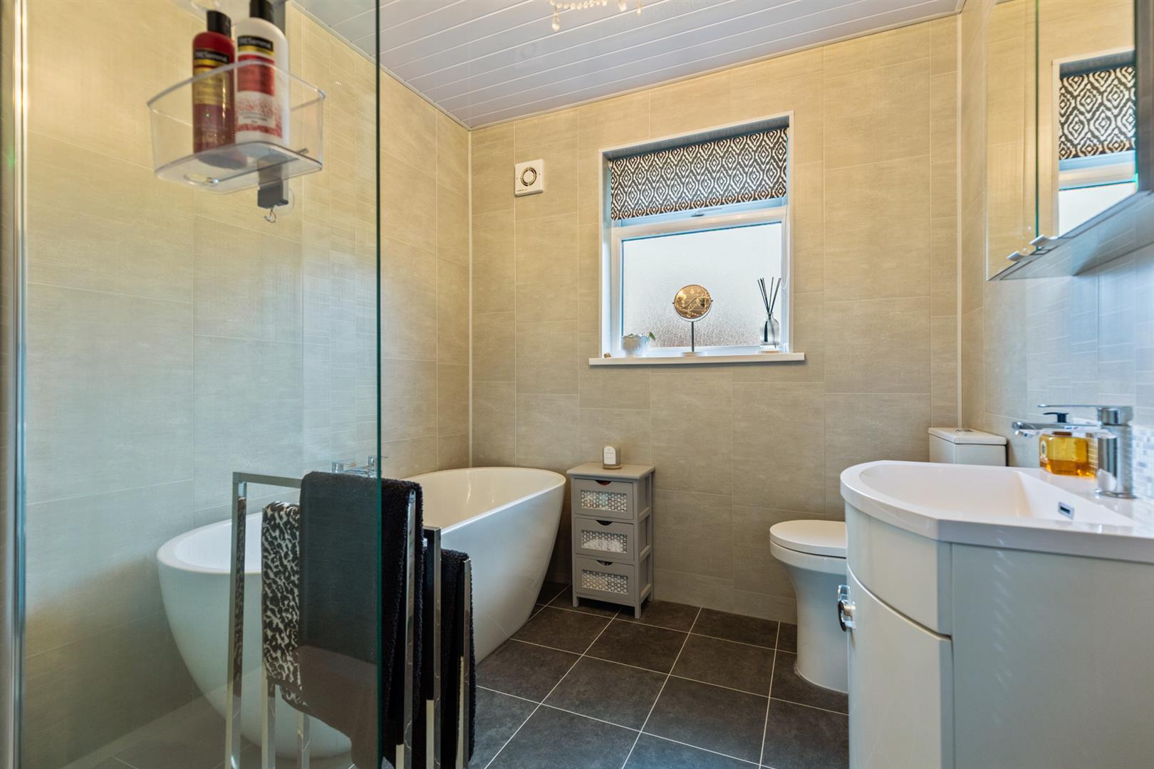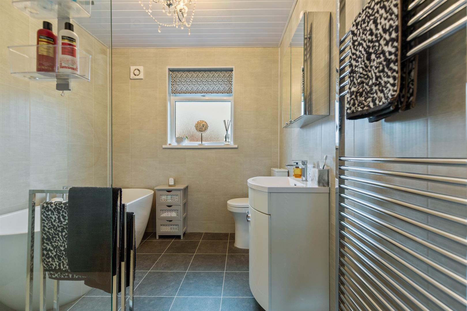 White suite comprising free standing bath with mixer tap, walk in wall mounted over head shower, low flush w/c, vanity unit with mixer tap and storage, panelled walls, heated towel rail and extractor fan.