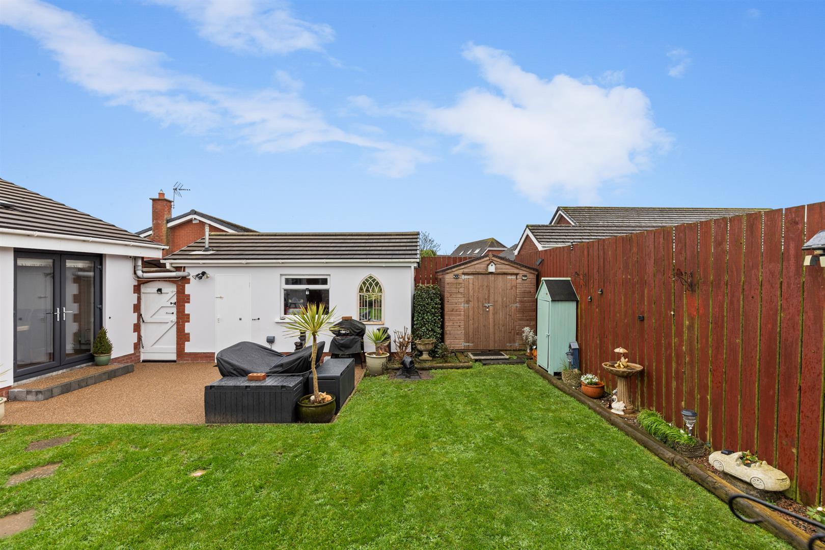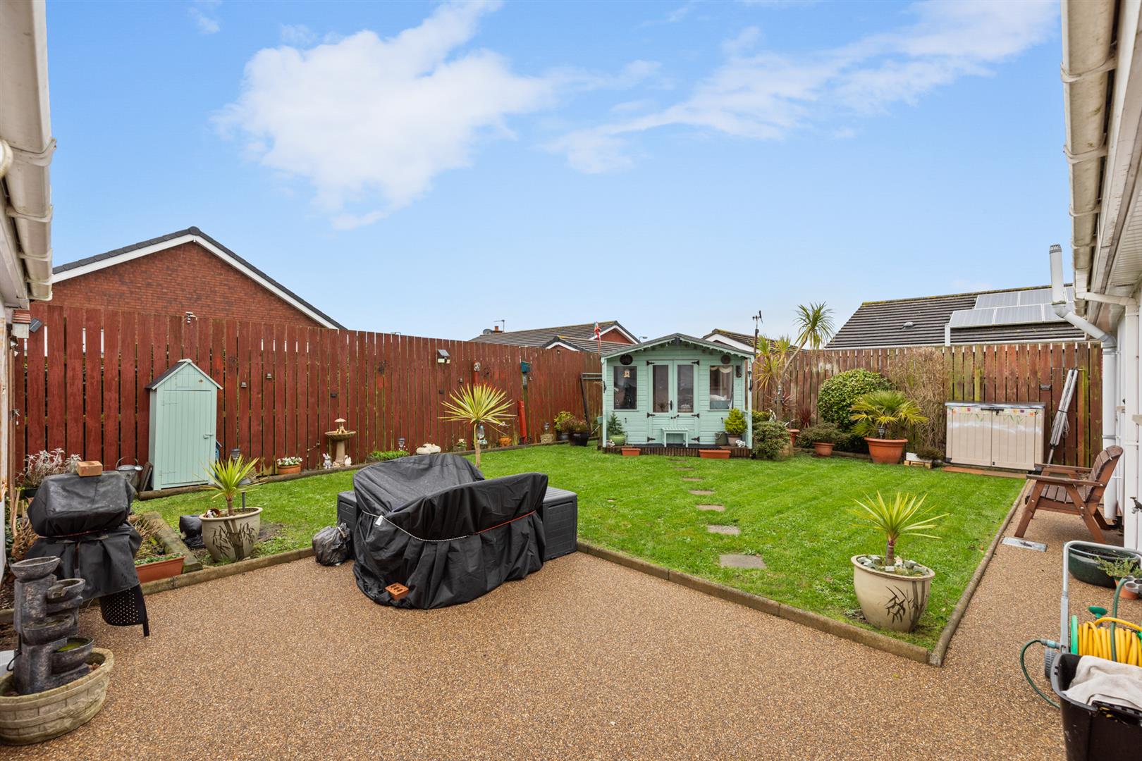 Externally, the property is equally appealing. To the front is a lawned garden with mature shrubs and hedging, along with a paved driveway providing ample off-street parking. The attached garage features an electric roller door, oil fired boiler, power and lighting. The fully enclosed rear garden offers a private and attractive outdoor space with lawn, paved areas, summer house, planted beds, outside tap and lighting, and convenient side access.