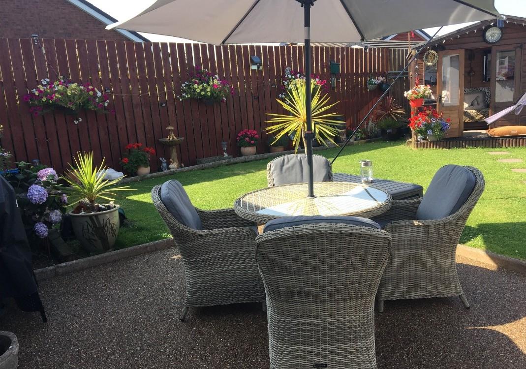Rear: Fully enclosed, area in lawn, resin bound paving, summer house, space for storage, area in beds with shrubs and hedging, outside tap and light, side gate for bin access.
