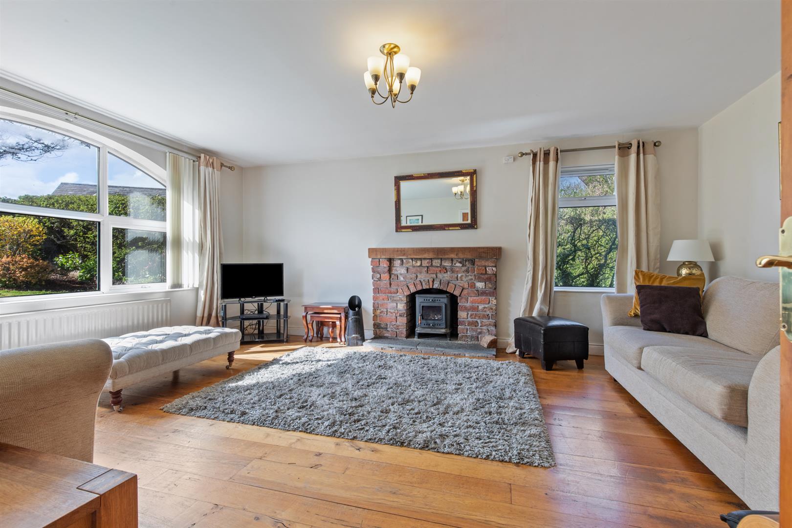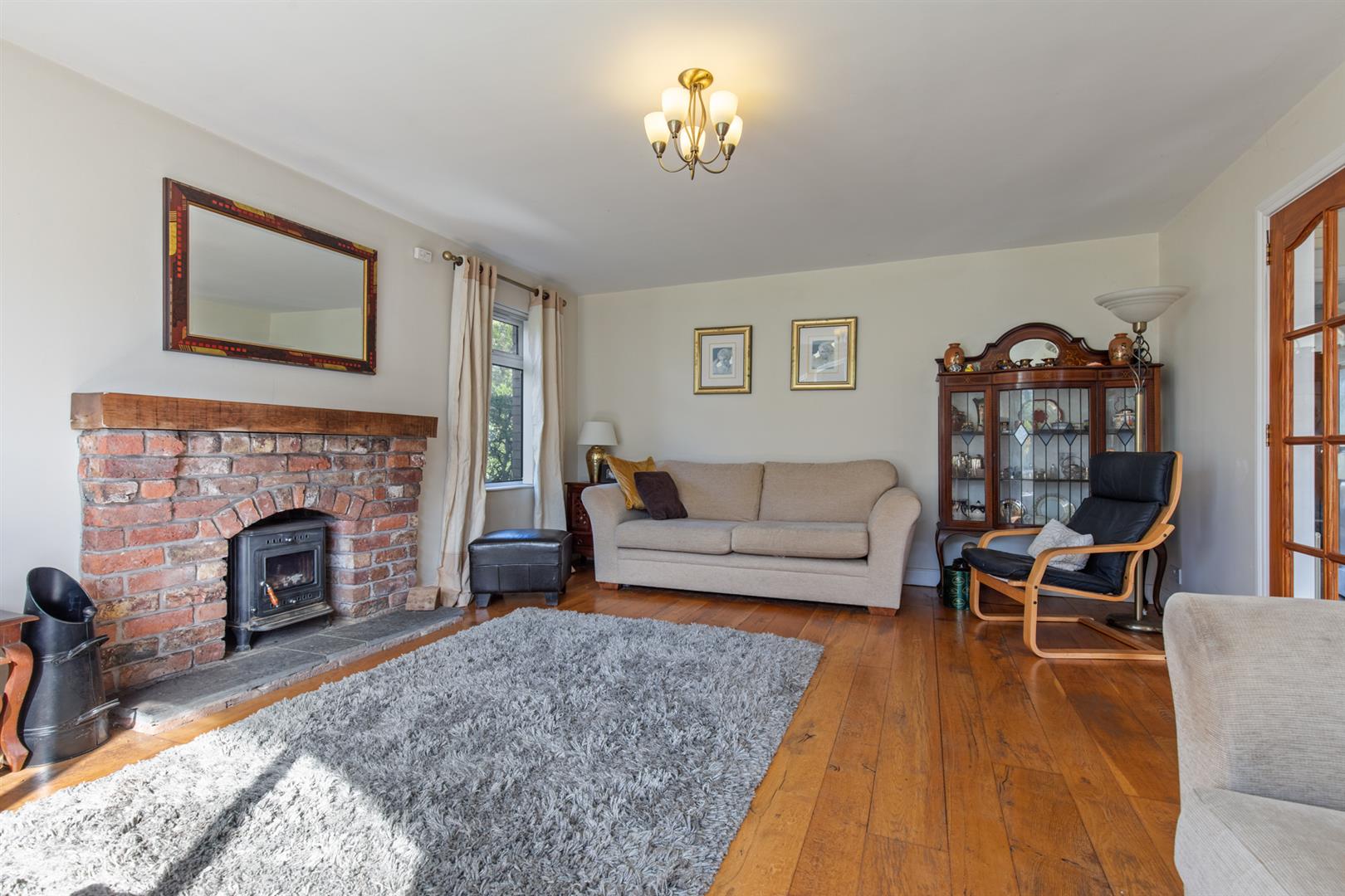 Multi-fuel stove, tiled hearth, brick surround and wooden mantle. Solid wood floor.