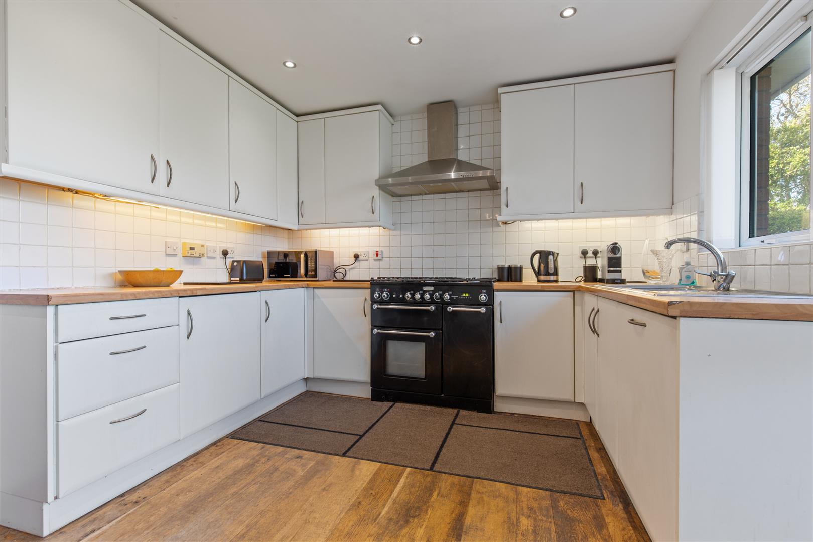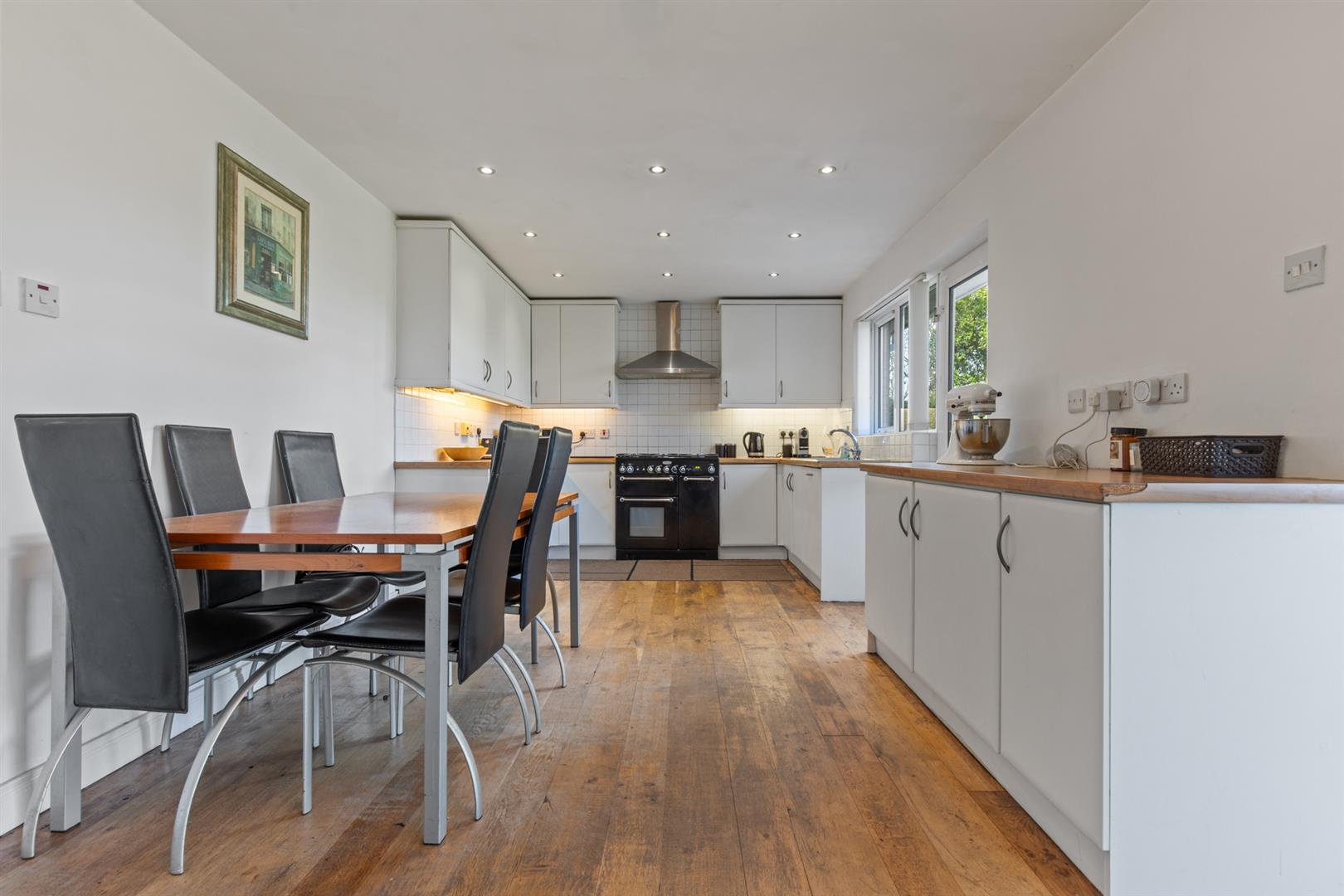 Range of high and low level units with laminate work surfaces, one and a quarter stainless steel sink with mixer tap and drainer, integrated dishwasher, space for range cooker, stainless steel extractor fan and hood, space for fridge/freezer, space for dining, recessed spotlights, partially tiled walls, solid wood floor, door to enclosed rear garden.