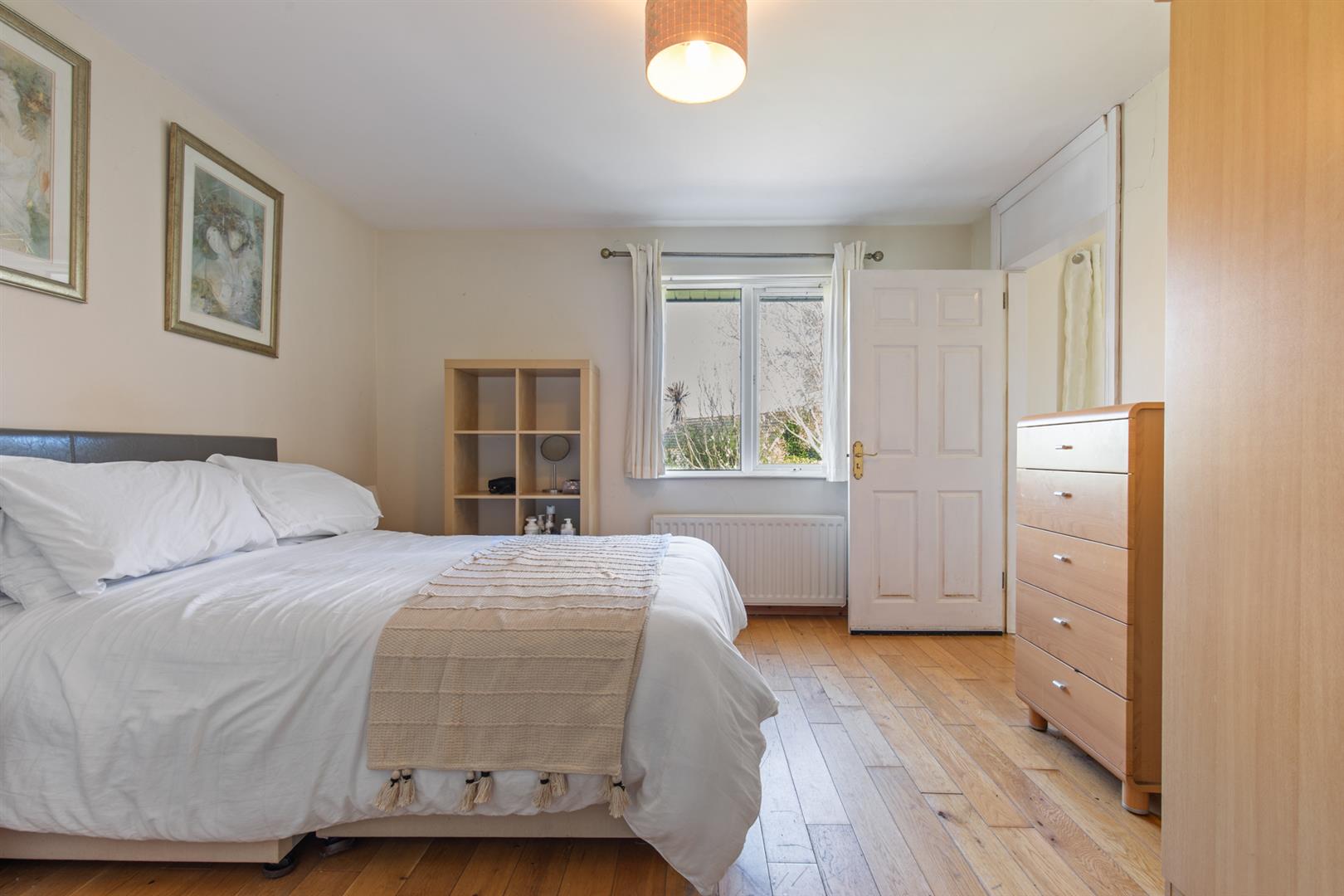 Double bedroom with wood laminate flooring.