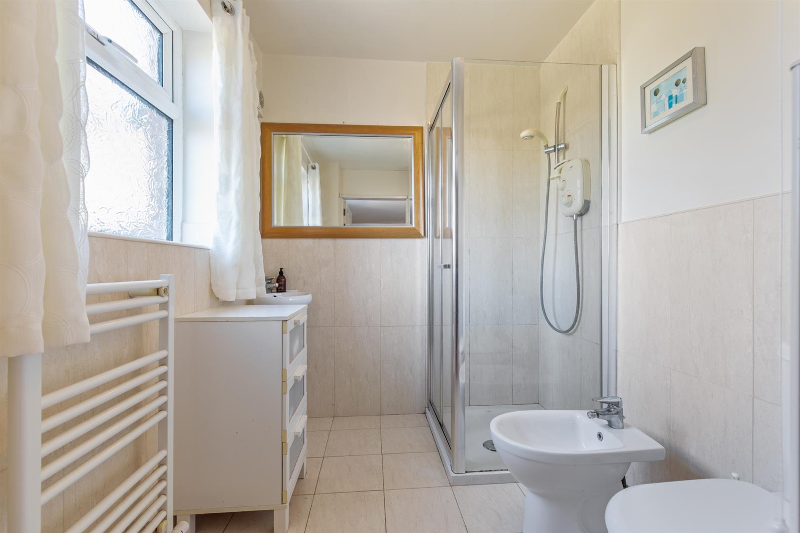 White suite comprising corner shower enclosure with wall mounted overhead shower and sliding glass doors, wall mounted wash hand basin with mixer tap, low flush w/c, bidet, heated towel rail, extractor fan, tiled floor and partially tiled walls.