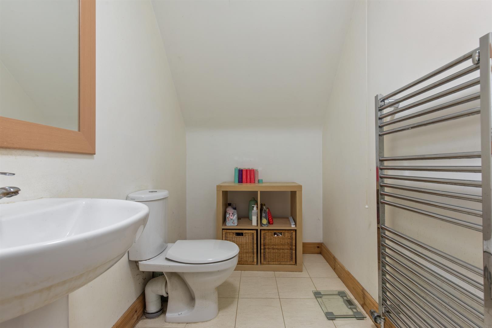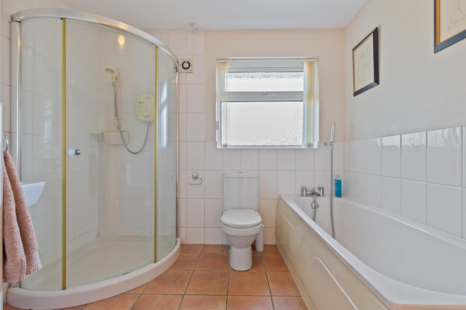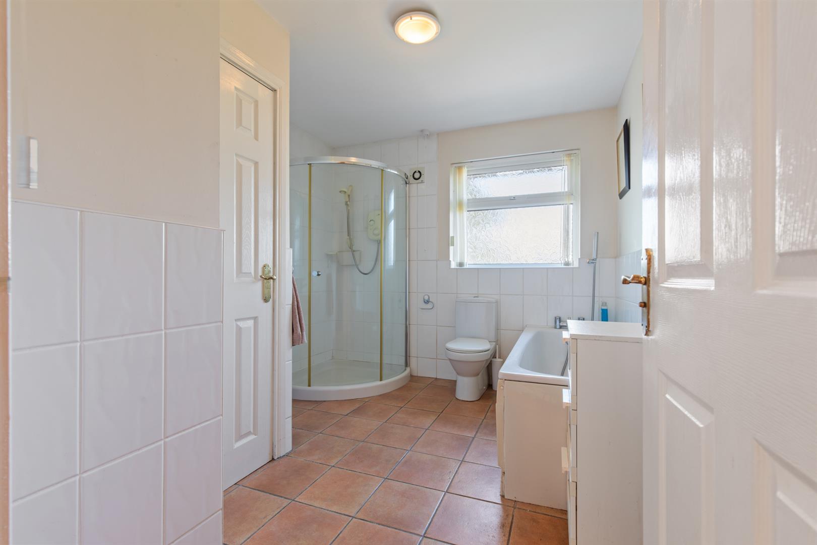 White suite comprising panelled bath with shower attachment, corner shower enclosure with wall mounted overhead shower, sliding door, pedestal wash hand basin with mixer tap, low flush w/c, extractor fan, tiled floor, partially tiled walls, hot press and storage.