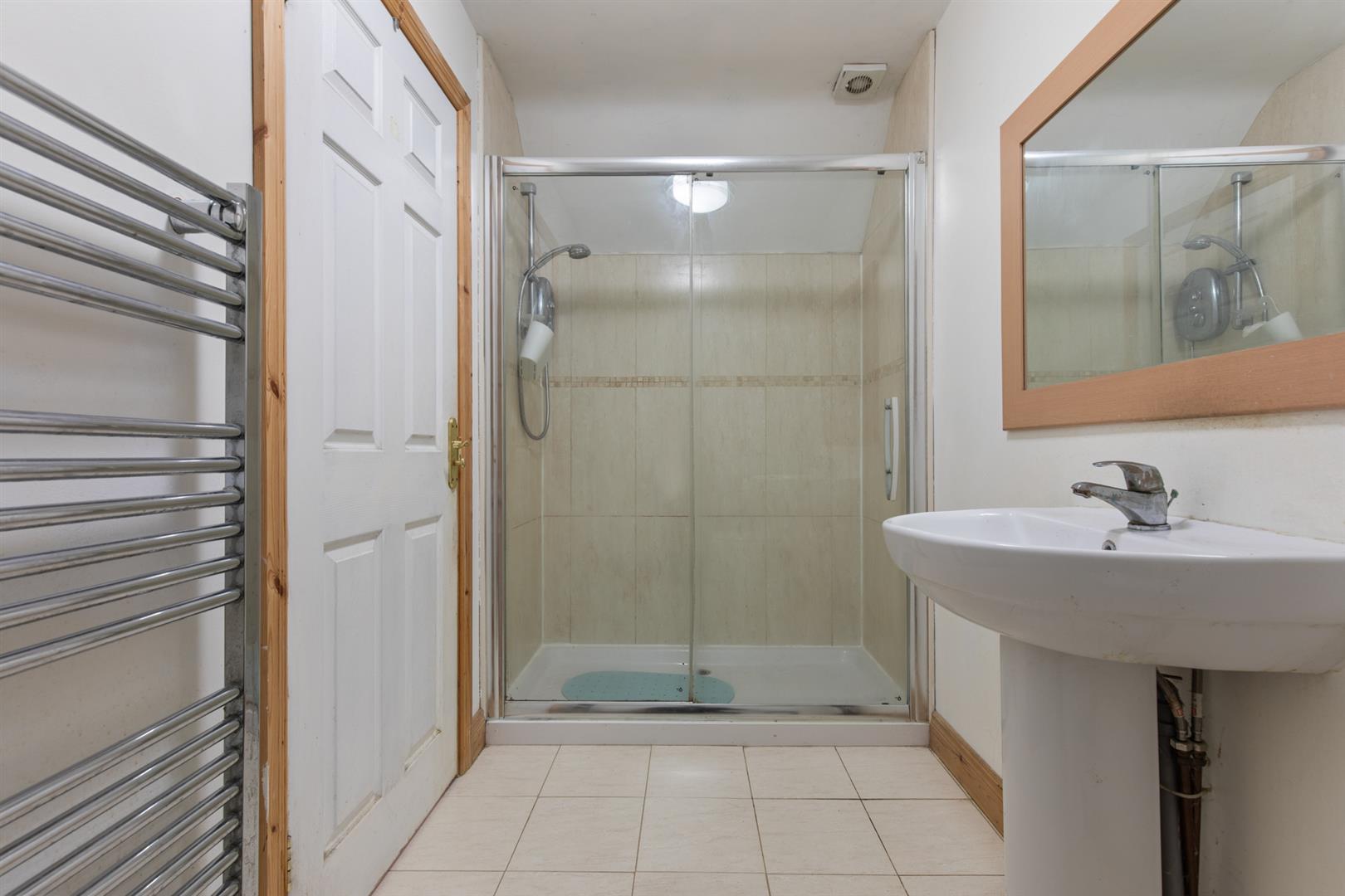 White suite comprising walk in shower enclosure with wall mounted overhead shower and sliding glass doors, pedestal wash hand basin with mixer tap, low flush w/c, heated towel rail, tiled floor, partially tiled walls and extractor fan.