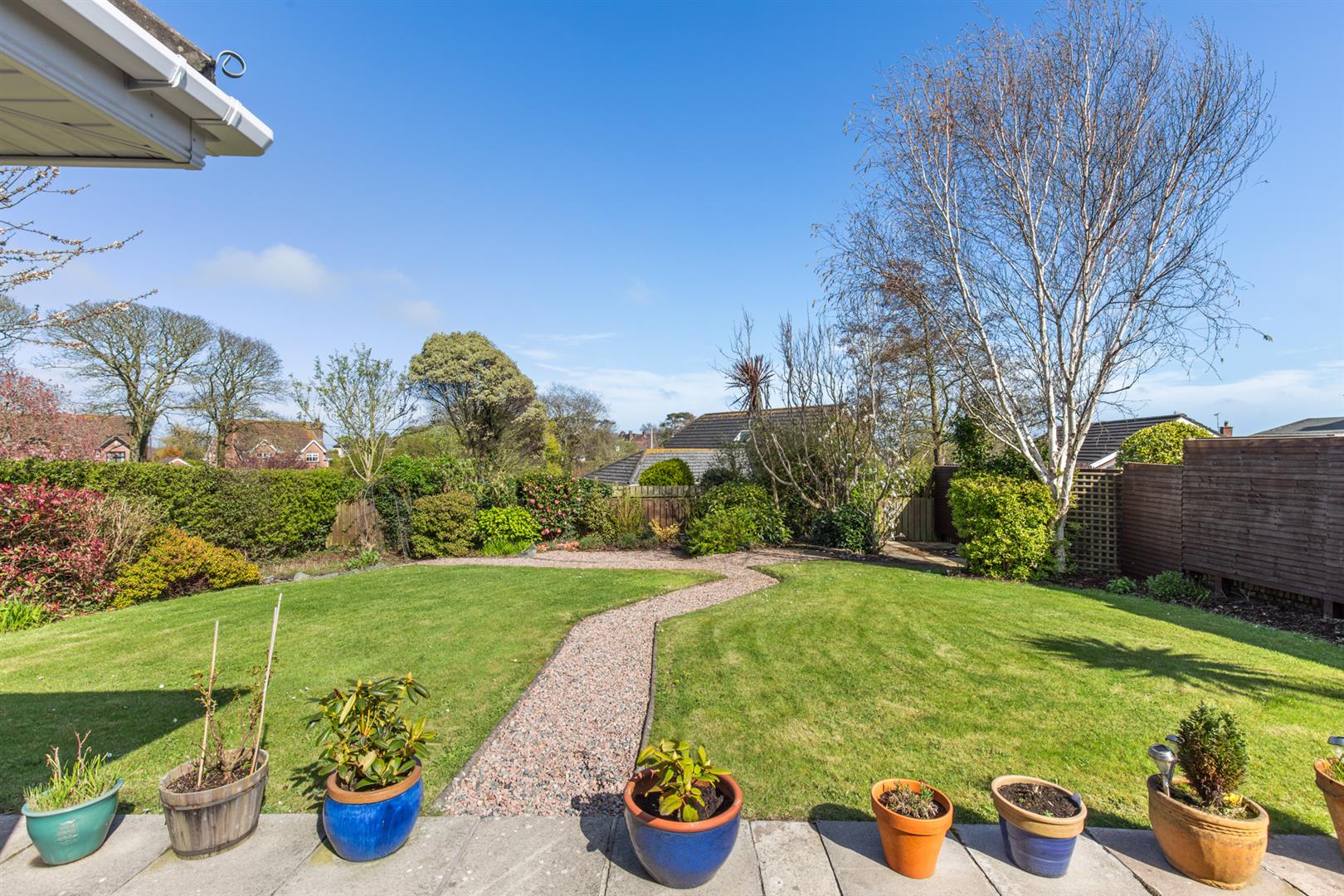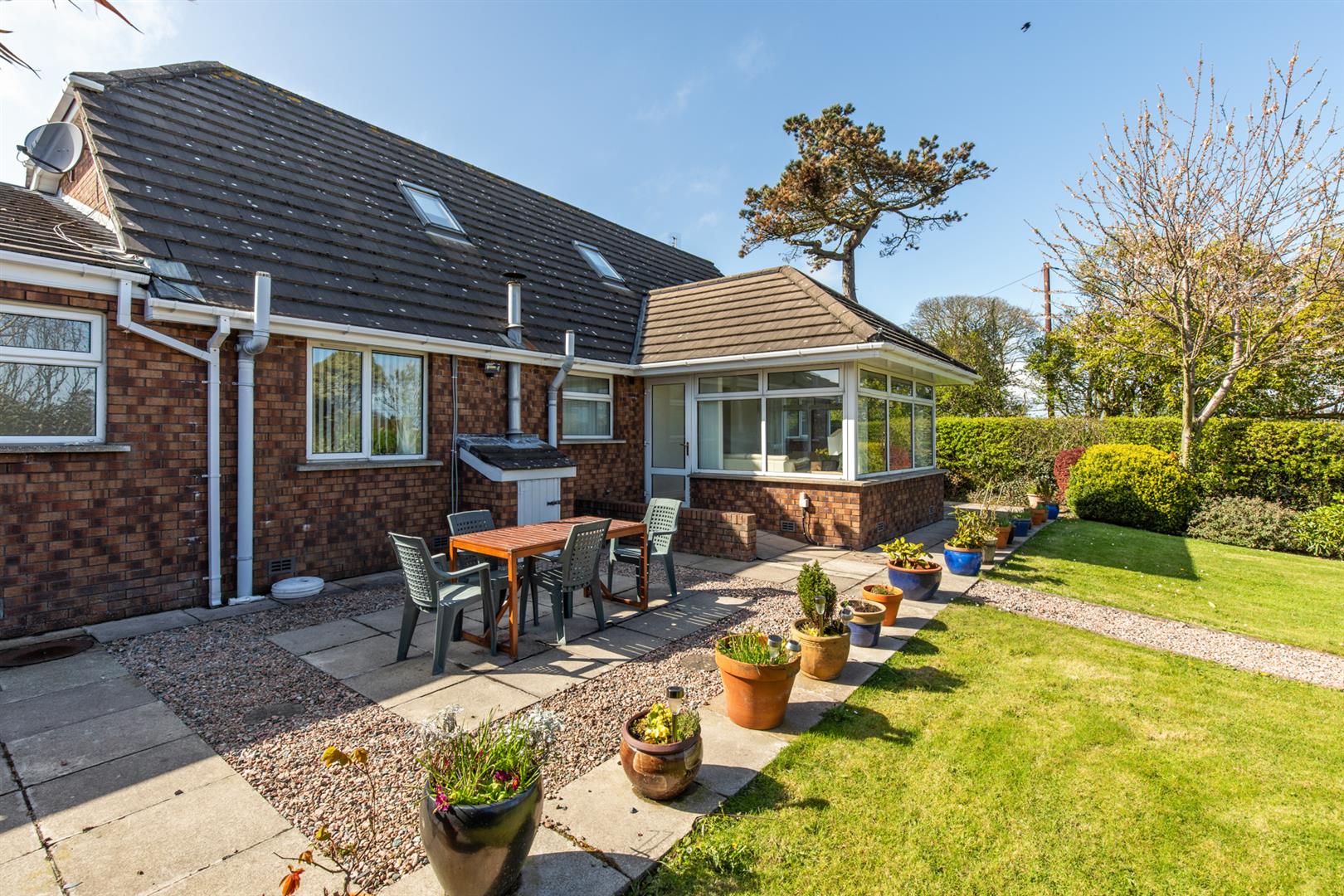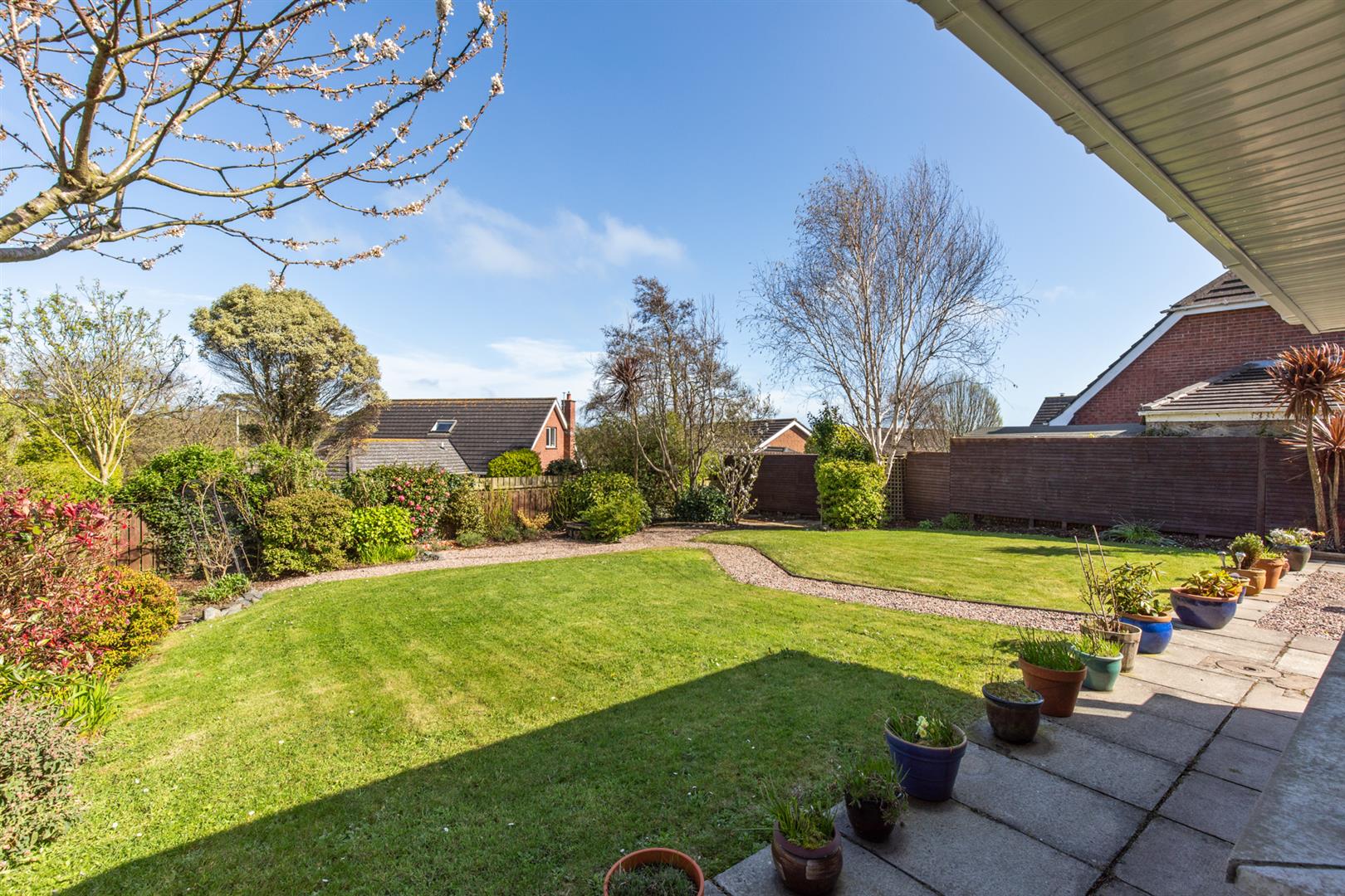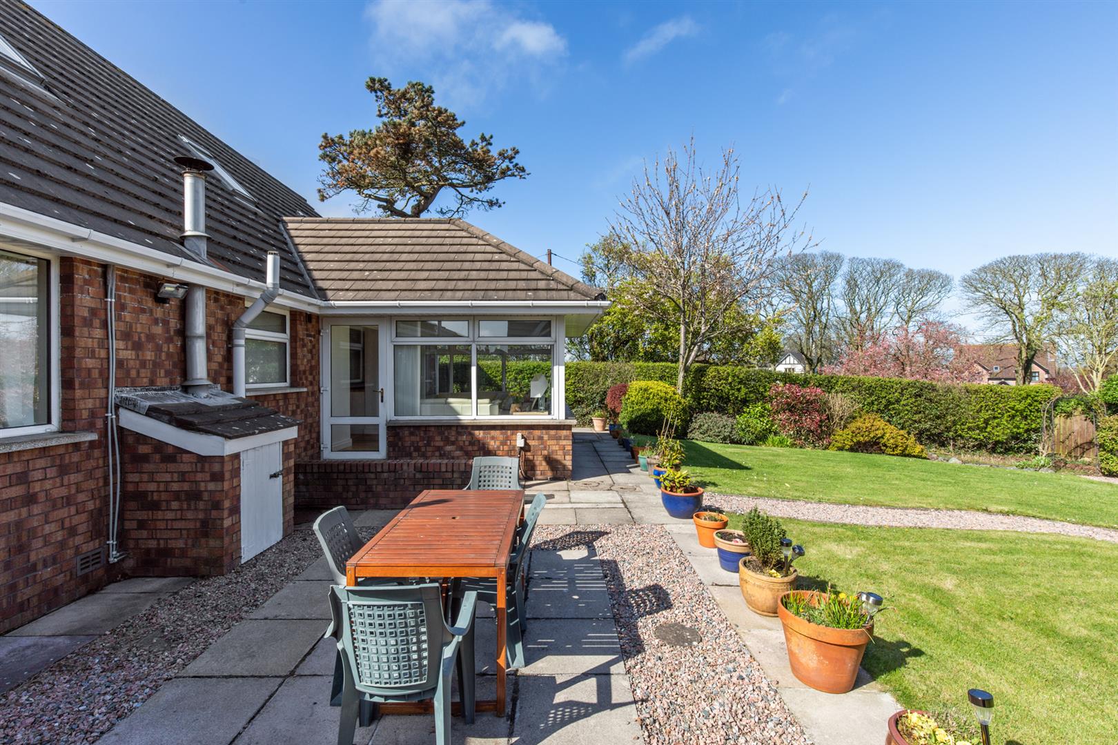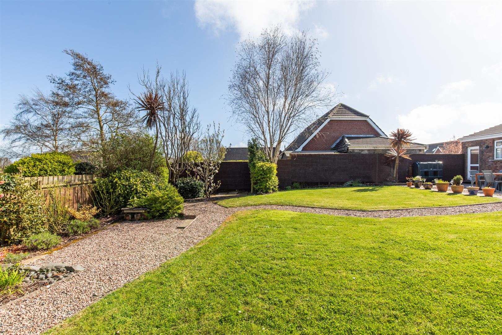 Rear - Fully enclosed, landscaped garden, area in lawn, area in stones, area in patio with space for entertaining, side gate for bin access, outside tap and light, oil fired boiler, oil tank, beds in mature shrubs and hedging.