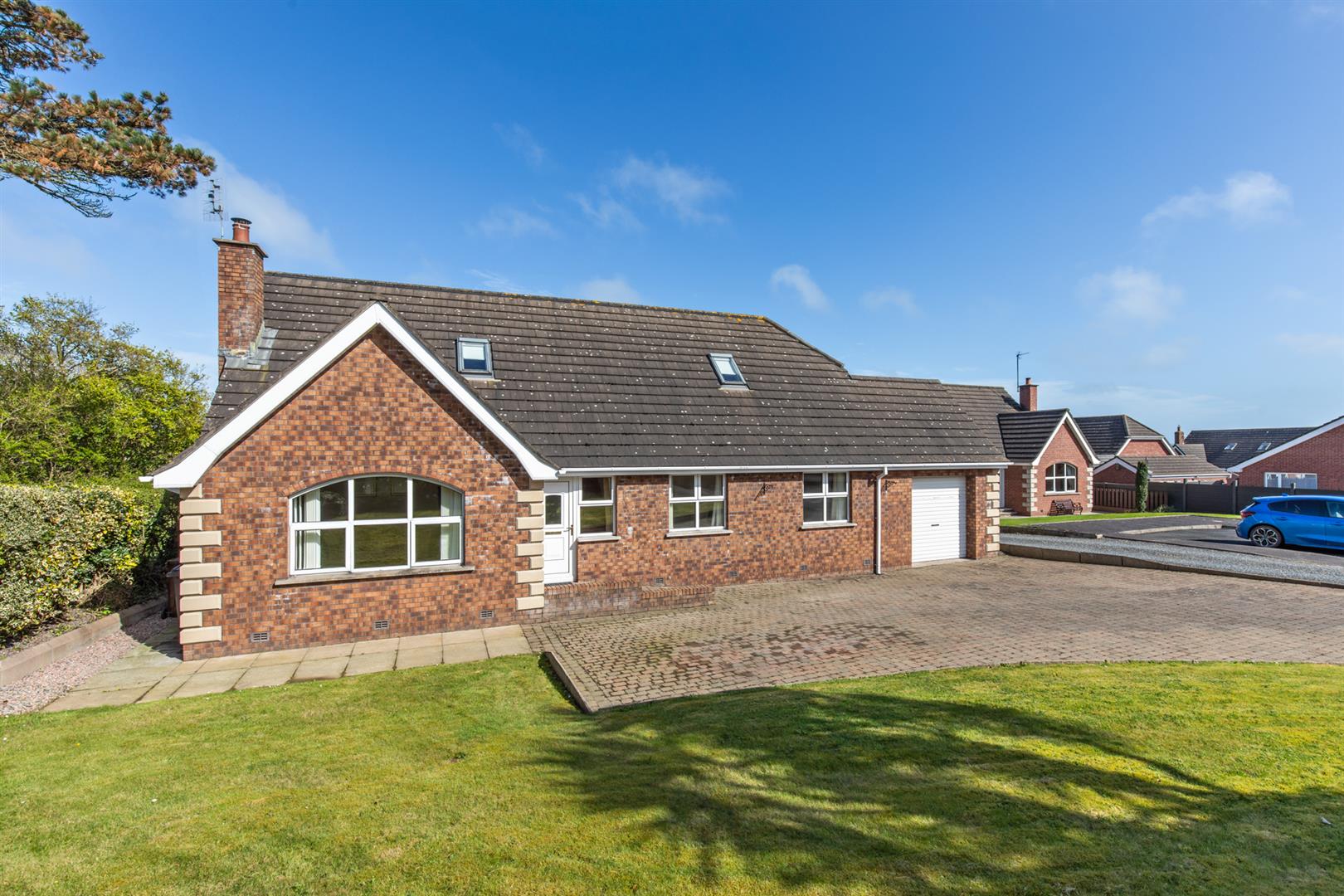 Front & Side - Brick paviour driveway with space for multiple vehicles, area in lawn, area in shrubs and hedging.