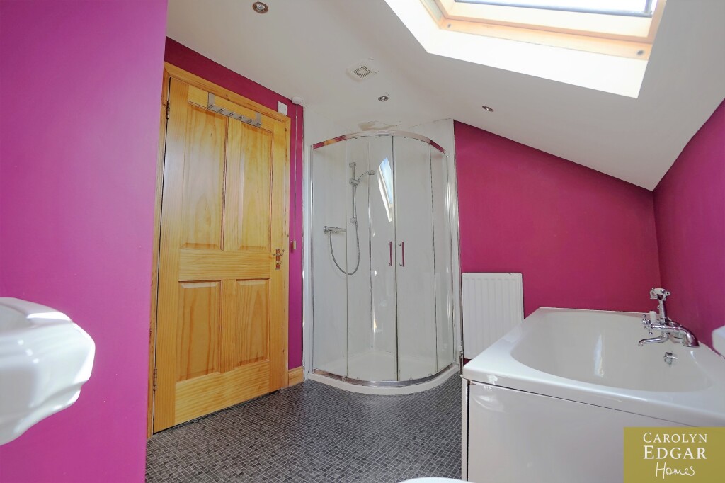 White bathroom suite comprising of low flush WC and pedestal wash hand basin. Fully tiled corner shower cubicle. Panelled bath. Tiled effect flooring.