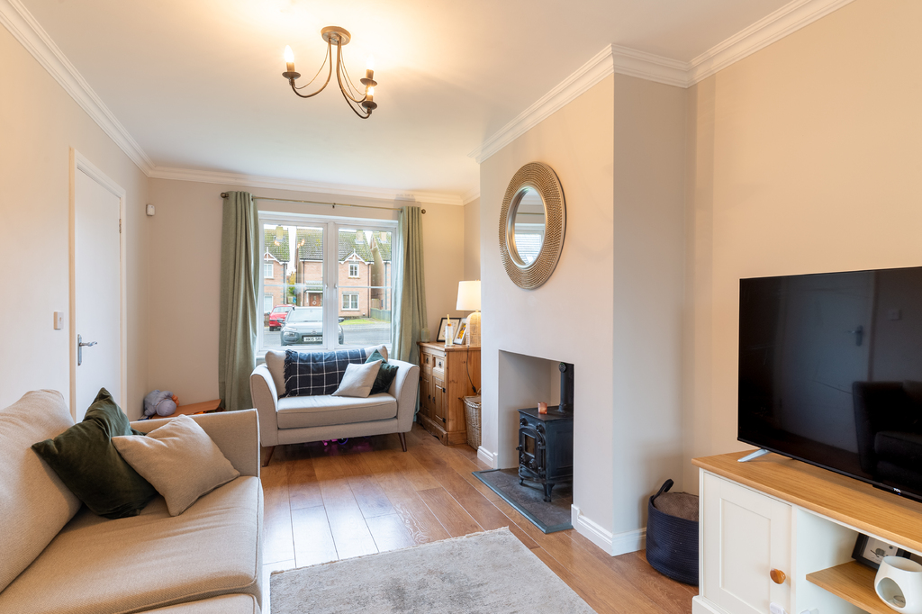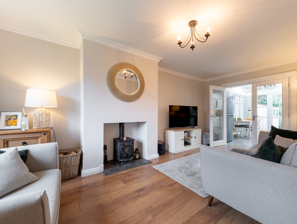 Large Lounge with Feature Wood Burning Stove and Bay Window