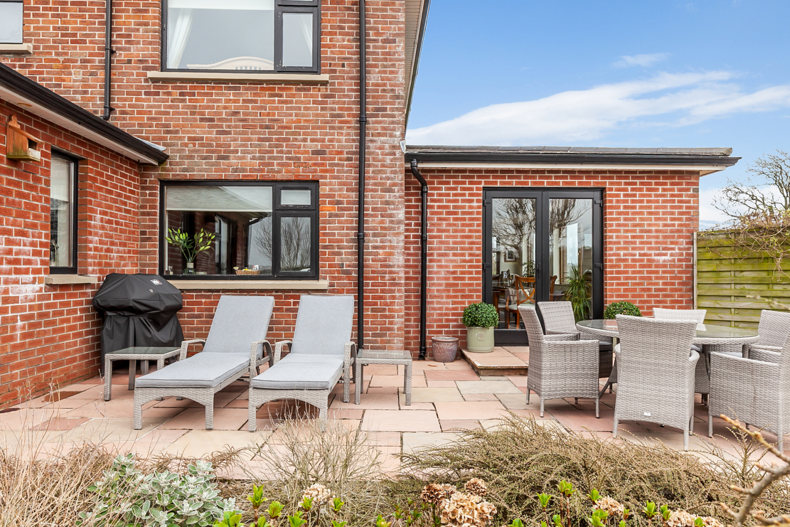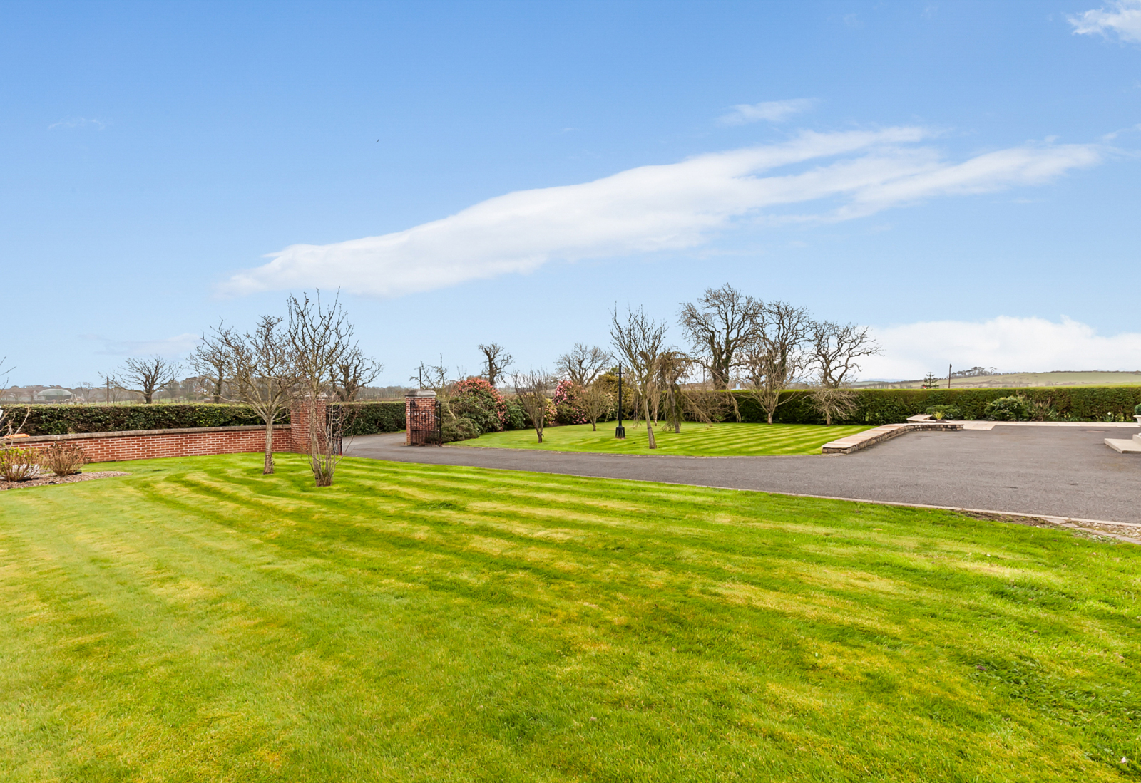 To front, side and rear laid out in lawns, well stocked shrub beds, feature sandstone patio and paths, hedging, ornamentla pond, outside lights, outside water tap, fencing, selection of trees, feature red brick garden wall with wrought iron gates.