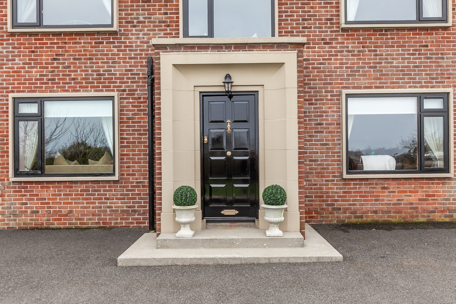 Painted solid mahogany front door, outside light.