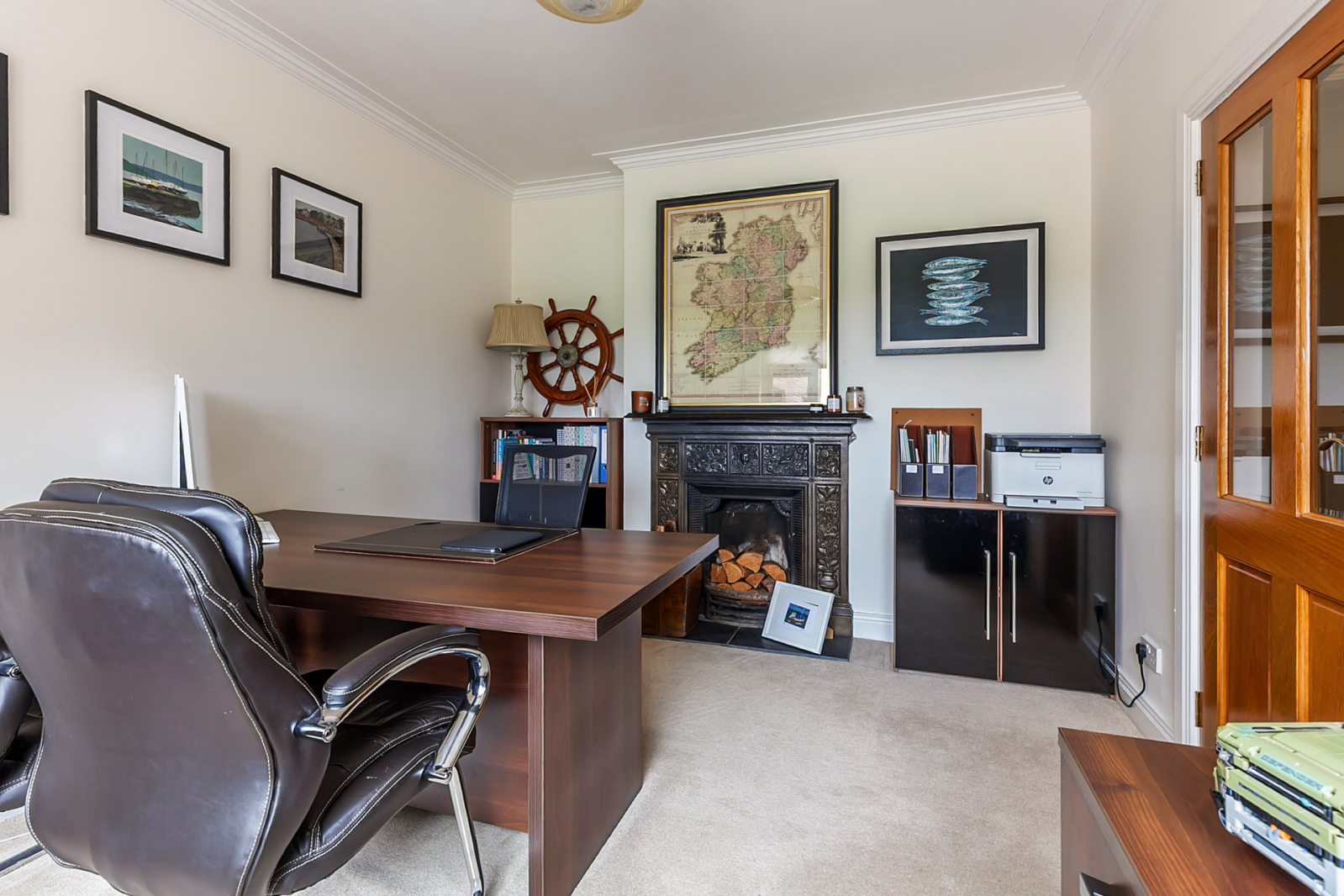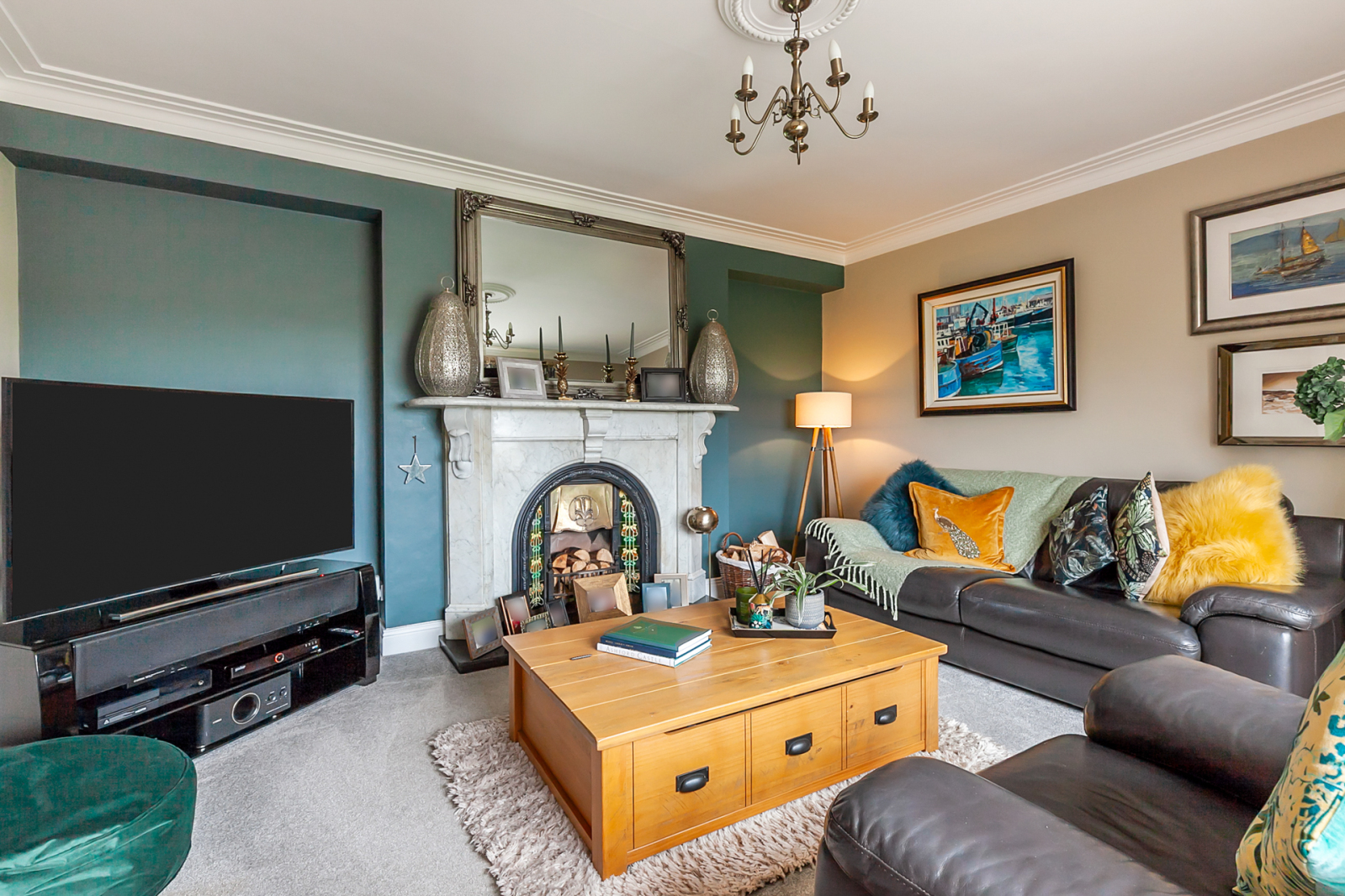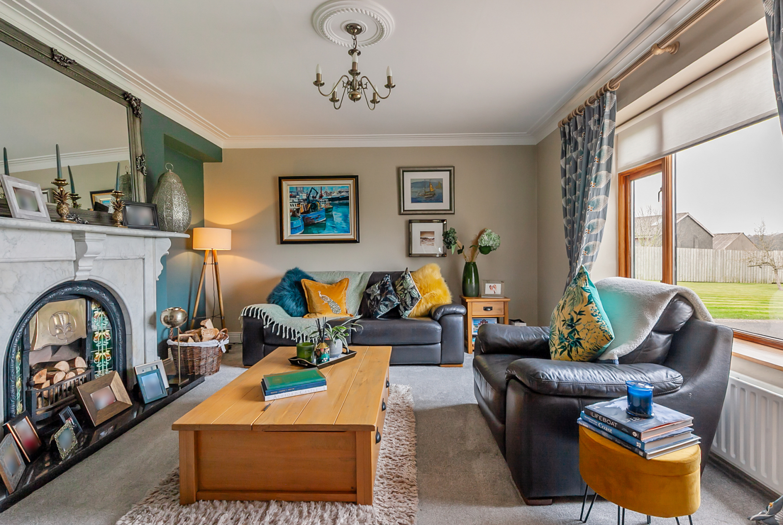 Feature cast iron fireplace with open fire, slate hearth, corniced ceiling, countryside views.