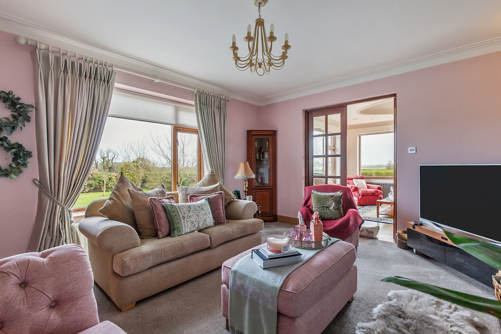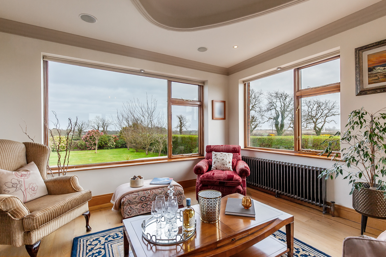 Feature recessed ceiling, polished oak floor, triple aspect, LED recessed spotlighting, wto cast iron radiators, countryside views, ceiling speakers, double glazed patio doors to rear garden, glazed door to: