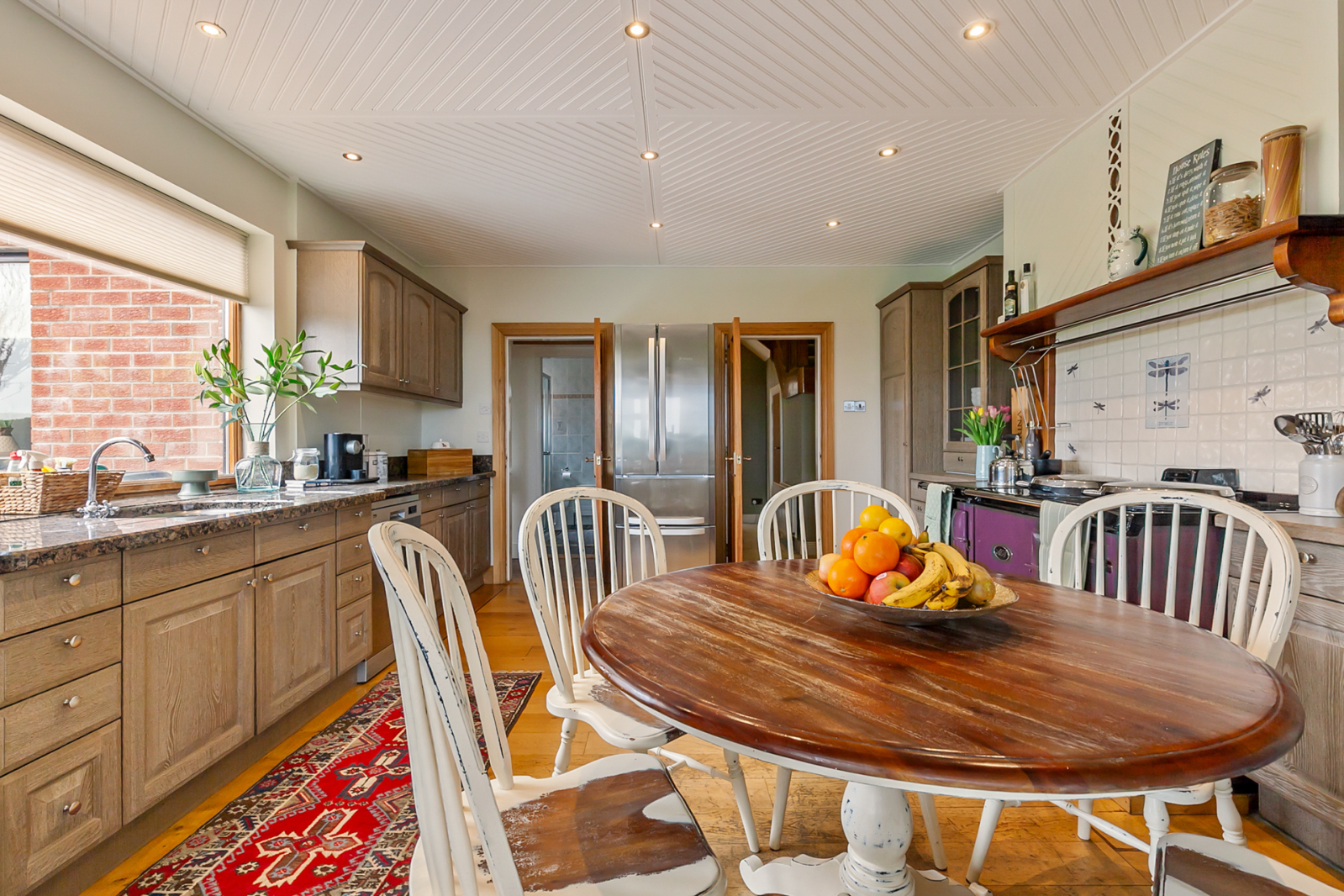 Recessed 1.5 tub single drainer sink unit with mixer taps, excellent range of high and low level limed oak units, granite worktops, feature Aubergine 4 oven Aga range with 2 hot plates and warming plate, plumbed for dishwasher, 3 display cabinets, wall tiling, tongue and groove panelled ceiling, LED recessed spotlighting, polished oak floor, countryside views.