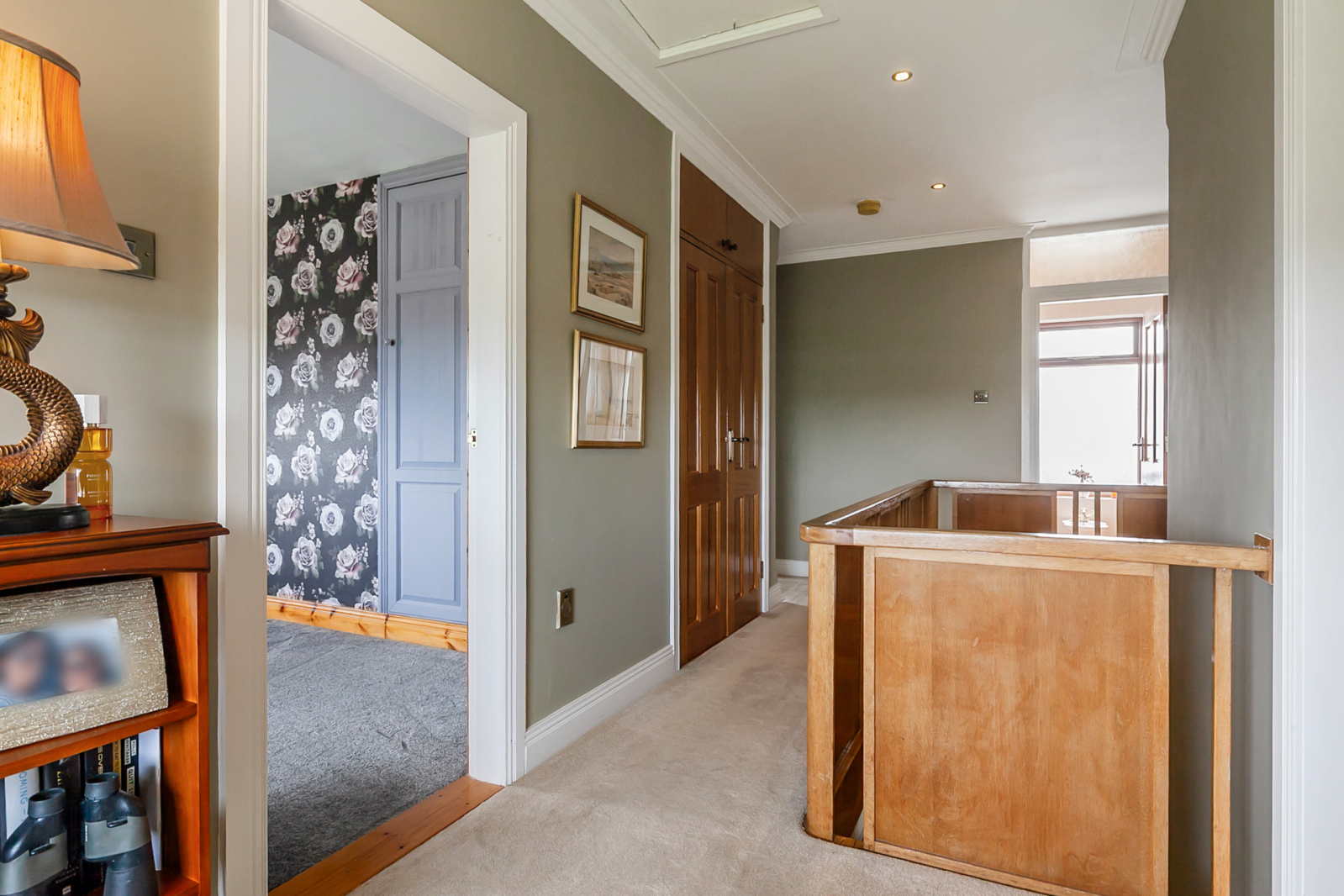 Under stairs cloaks storage with electric light, LED recessed spotlighting, corniced ceiling, telephone point.