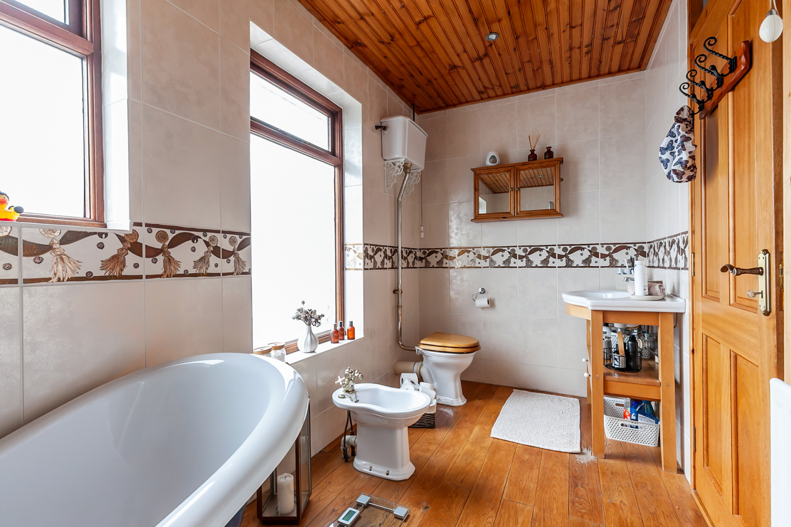 Traditional style white suite comprising: Roll top bath on oak stand, large separate fully tled shower cubicle with thermostatically controlled shower, rain head and telephone hand shower, wash hand basin with mixer taps on oak floor stand, high flush WC, bidet, fully tiled walls, polished oak floor, tongue and groove ceiling, LED recessed spotlighting.