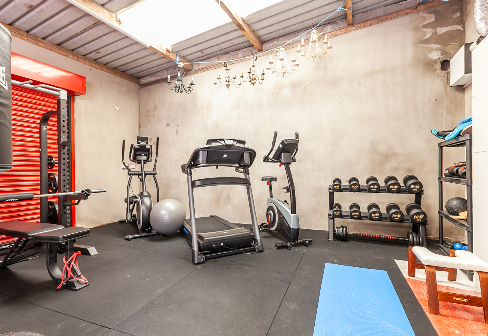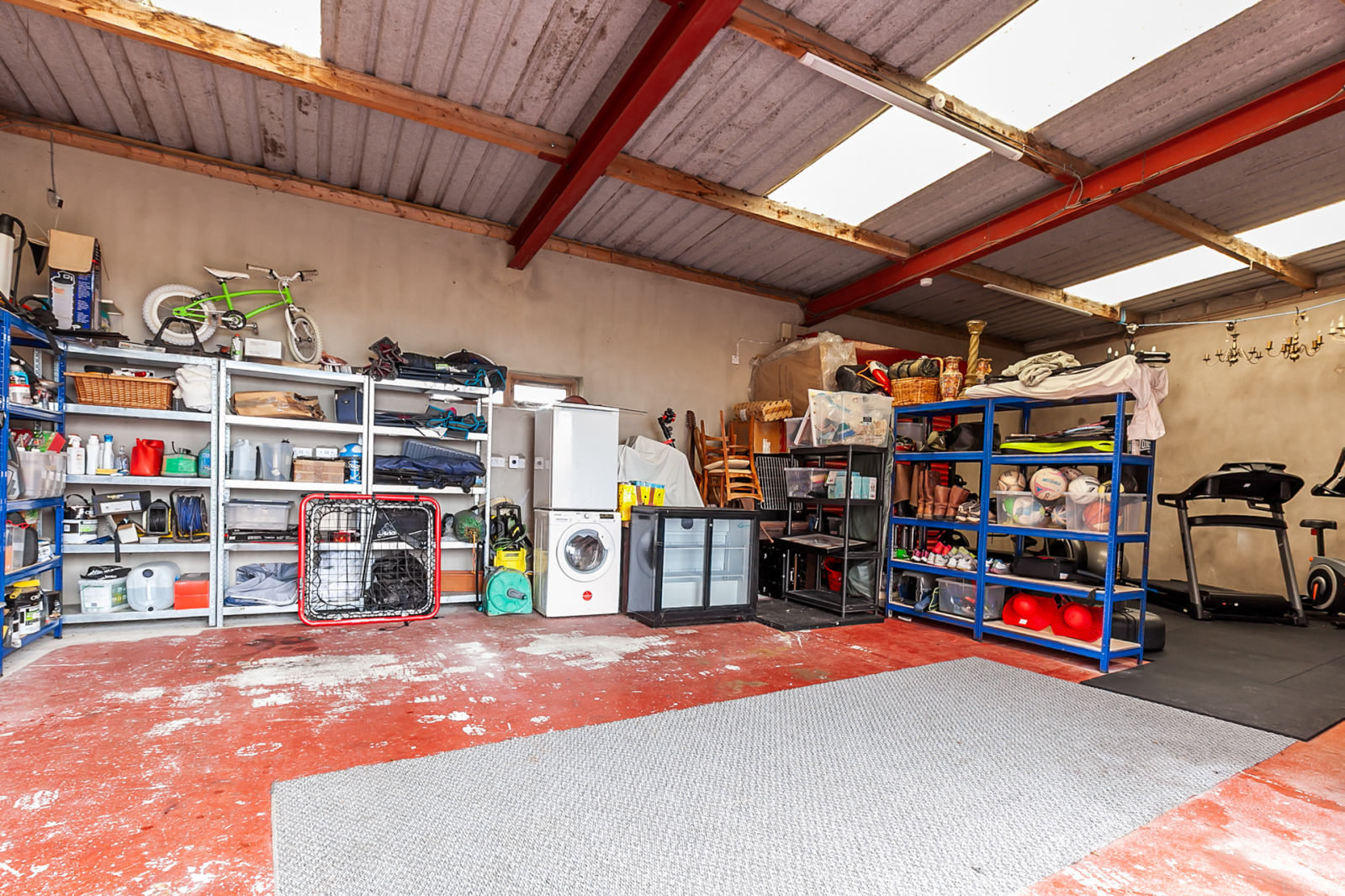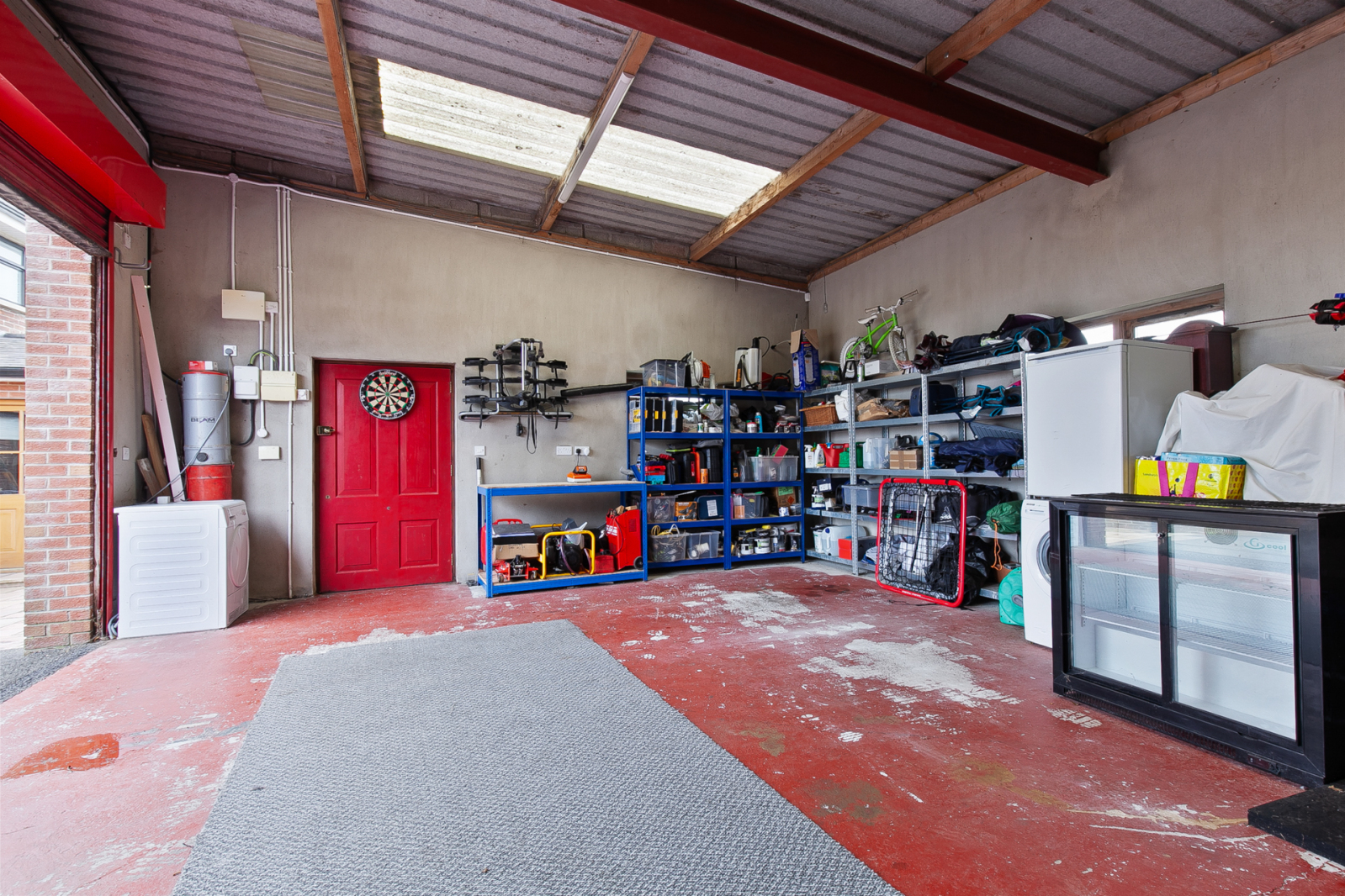 Electronically operated red roler shutter to front, light and power, sand and cement render internal walls, painted floor, red roller shutter to rear. Tarmac parking, approached via large tarmac driveway with parking for up to nine cars.