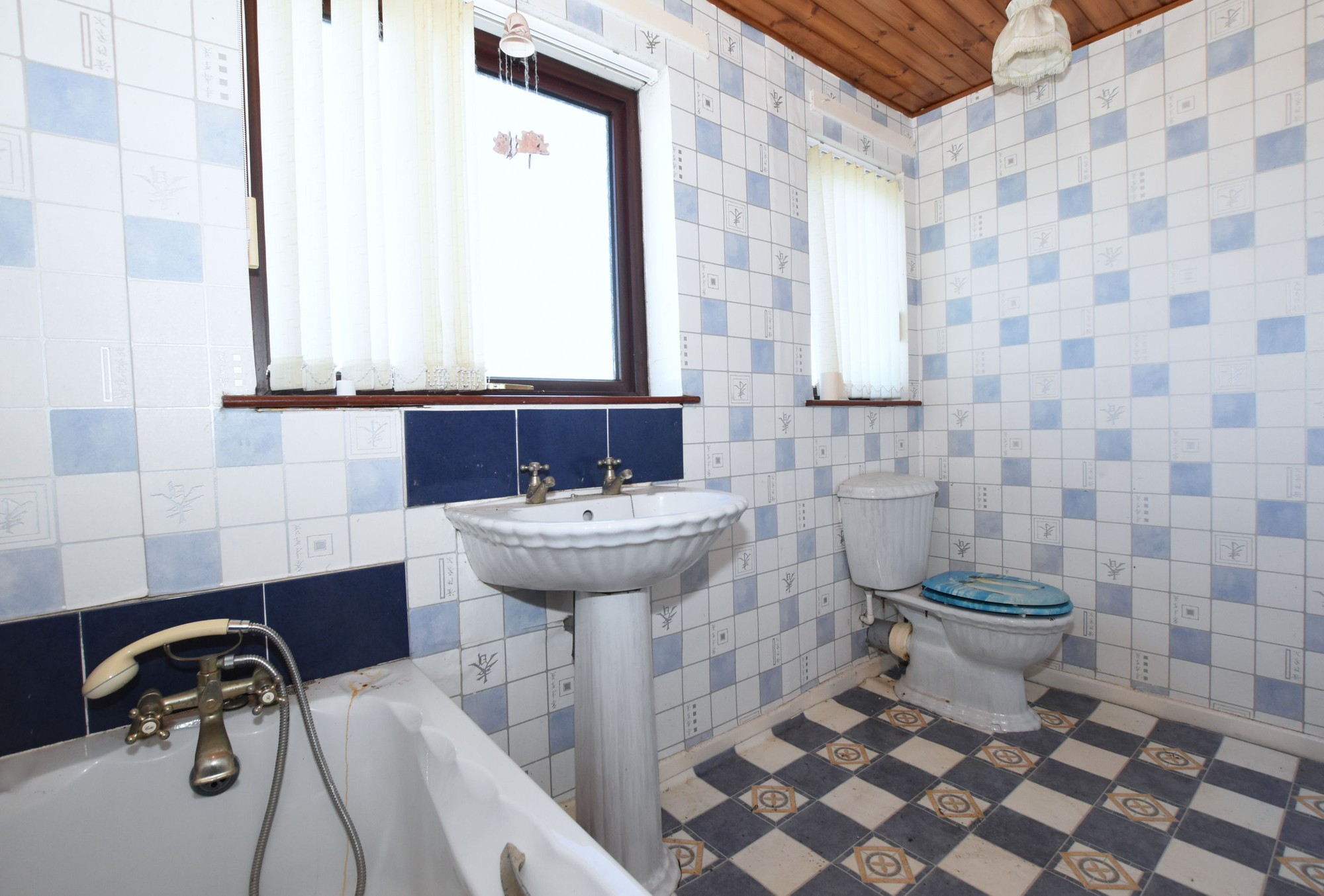 3 Piece suite comprising; Wooden Panel bath with Telephone hand shower, Pedestal wash hand basin and a Low Flush WC. Tongue and Groove ceiling; Single panel radiator.