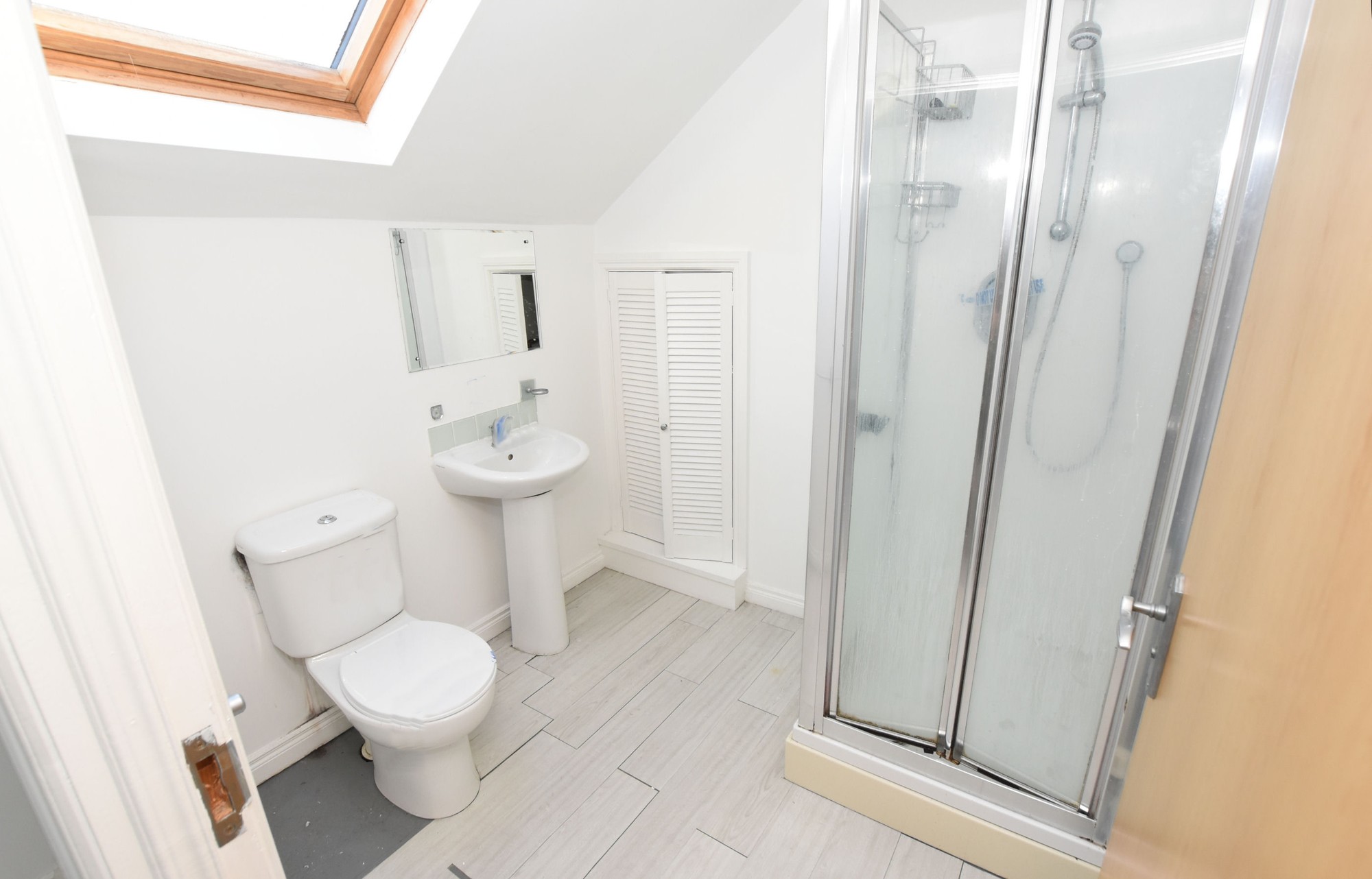 3 piece white suite comprising; corner shower cubicle, low flush WC, pedestal wash hand basin. Part PVC panelled walls, Velux window, single panel radiator. Pressurized Oil fired central heating unit storage.