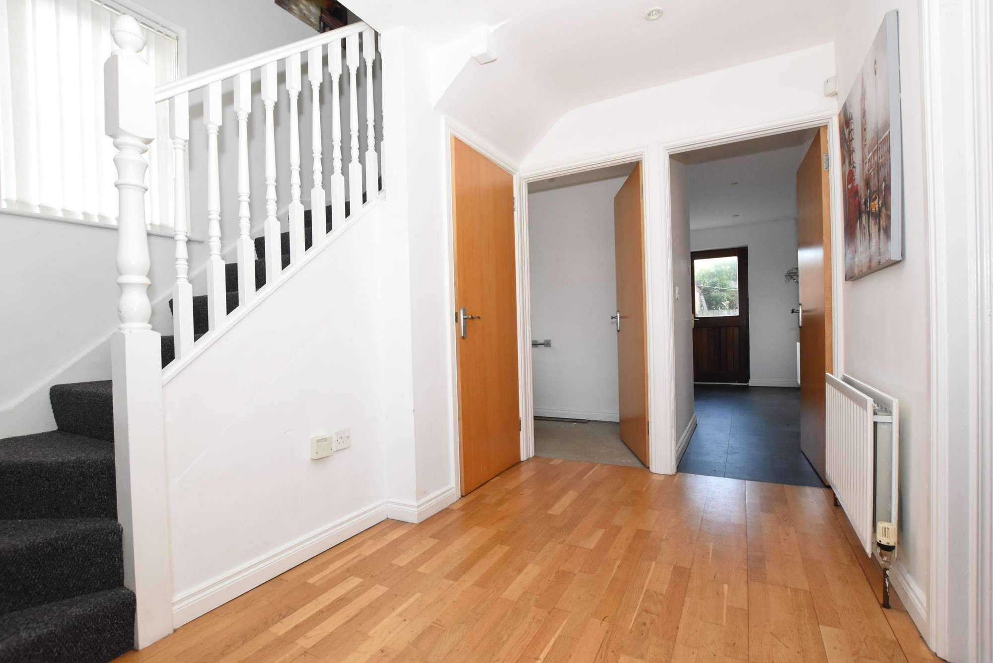 Hardwood door with double glazed window panel + matching glazed side panel. Oak effect flooring, LED lighting, double panel radiator. Storage cupboard.