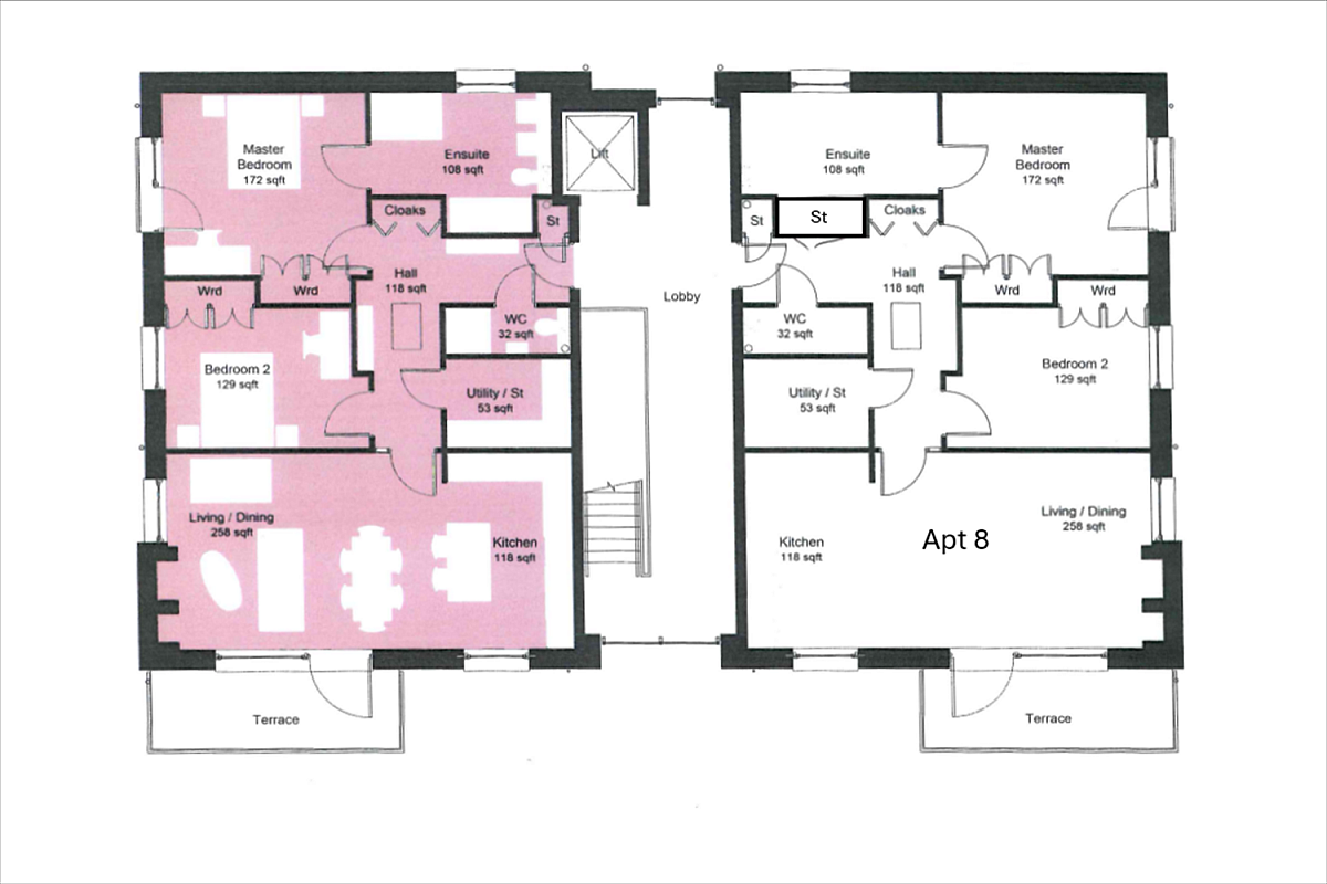 Tiled hallway with both lift and stairs access to first floor. Access to private garden for No.8.