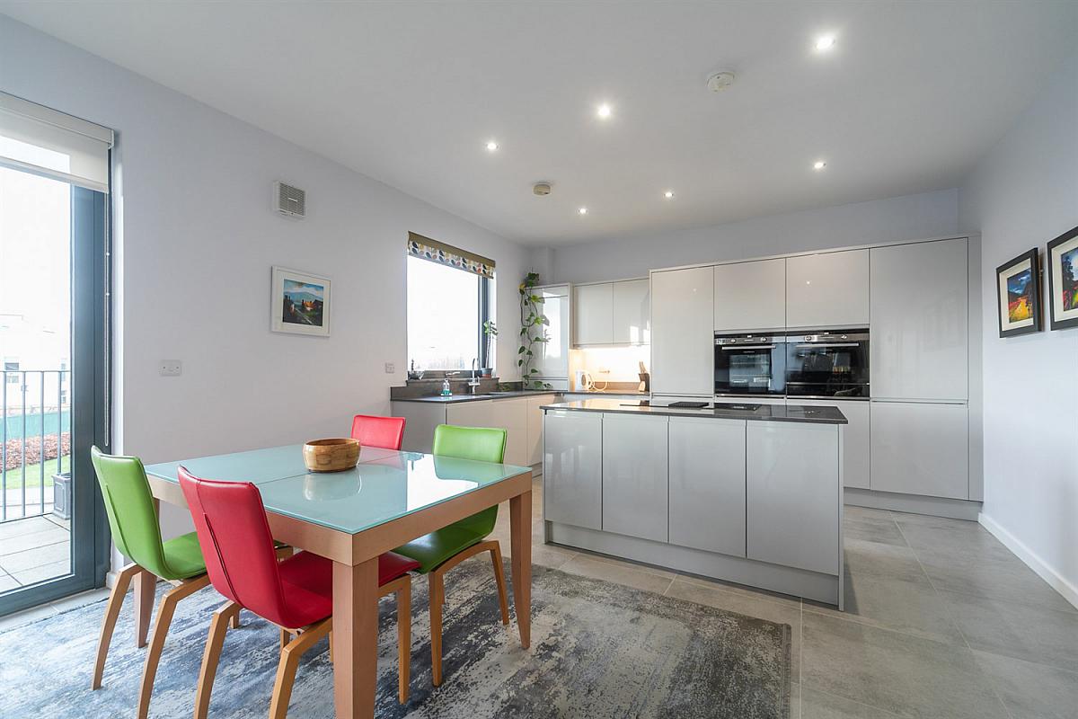 Full range of modern light grey gloss handle-less high and low level units, Starlite Grey Quartz worktop and upstands, 'Franke' 1½ bowl sink, stainless steel tap, integrated dishwasher, integrated fridge/freezer, eye level oven and combi with warming drawer, gas fired boiler. Island with ceramic induction hob and down draft extractor, drawers, and pull out power point.